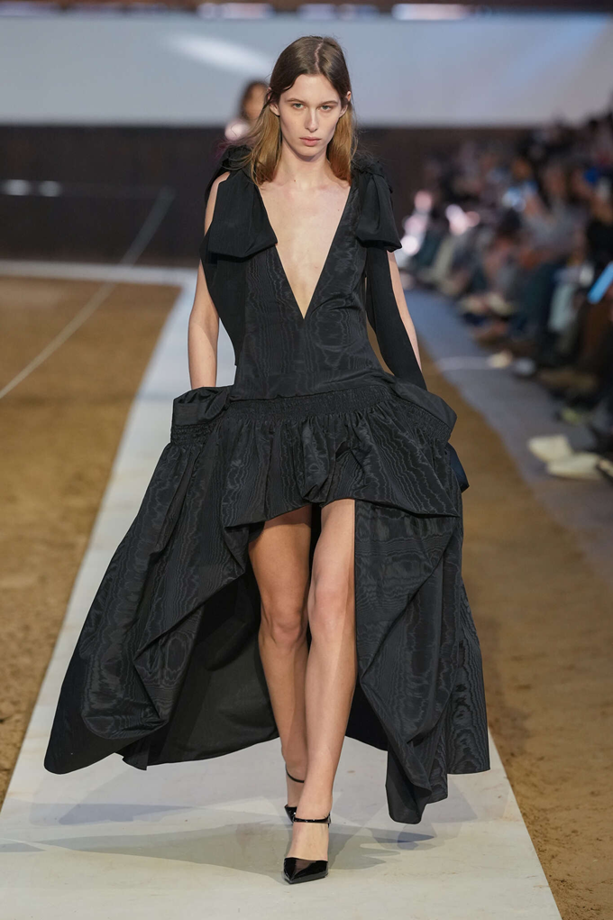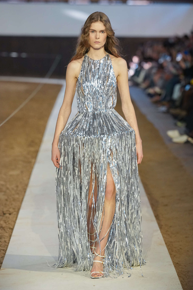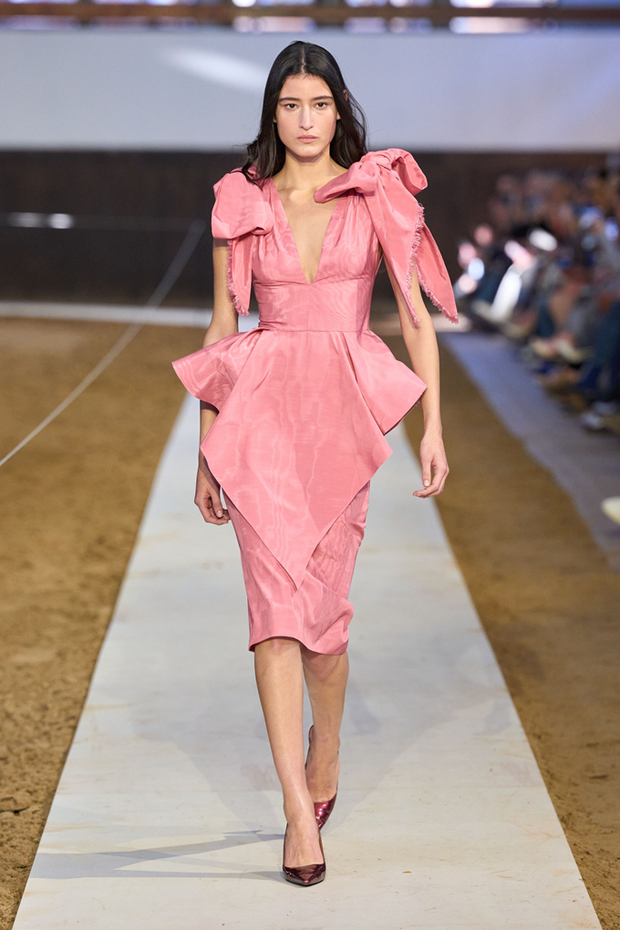 승마 부츠와 스터럽 팬츠를 프레피 스타일의 스웻 셔츠와 매치하고, 시퀸으로 뒤덮인 드레스와 스커트는 엉덩이 부분을 버슬과 주름 장식을 더해 승마 테마의 구조적인 테일러링과 우아함이 균형을 이루었다.