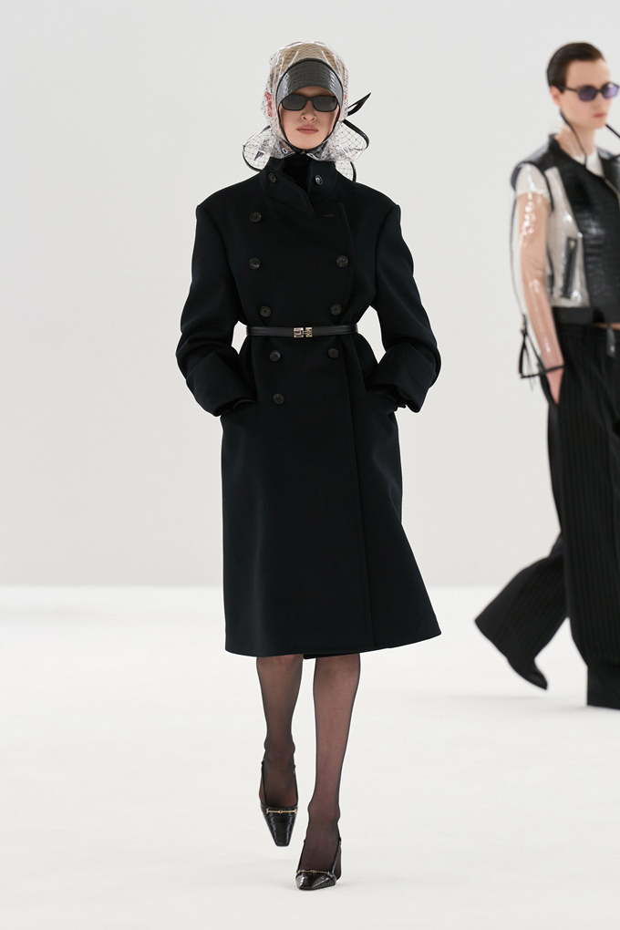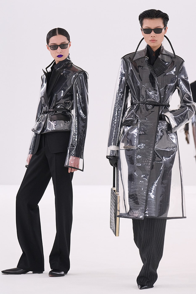 시스루 셔츠부터 투명한 재킷, 스커트, 트렌치 코트, 레인햇 등 투명한 소재를 활용한 아이템은 영화 '아메리칸 사이코'를 연상시키는 시크함을 연출했다 .
