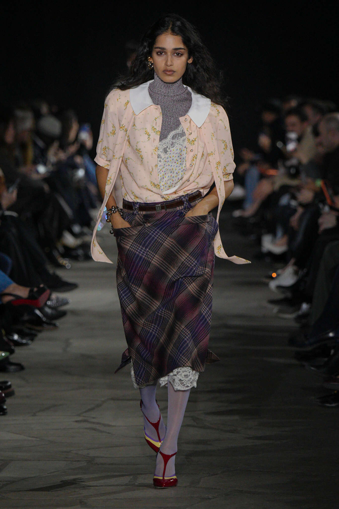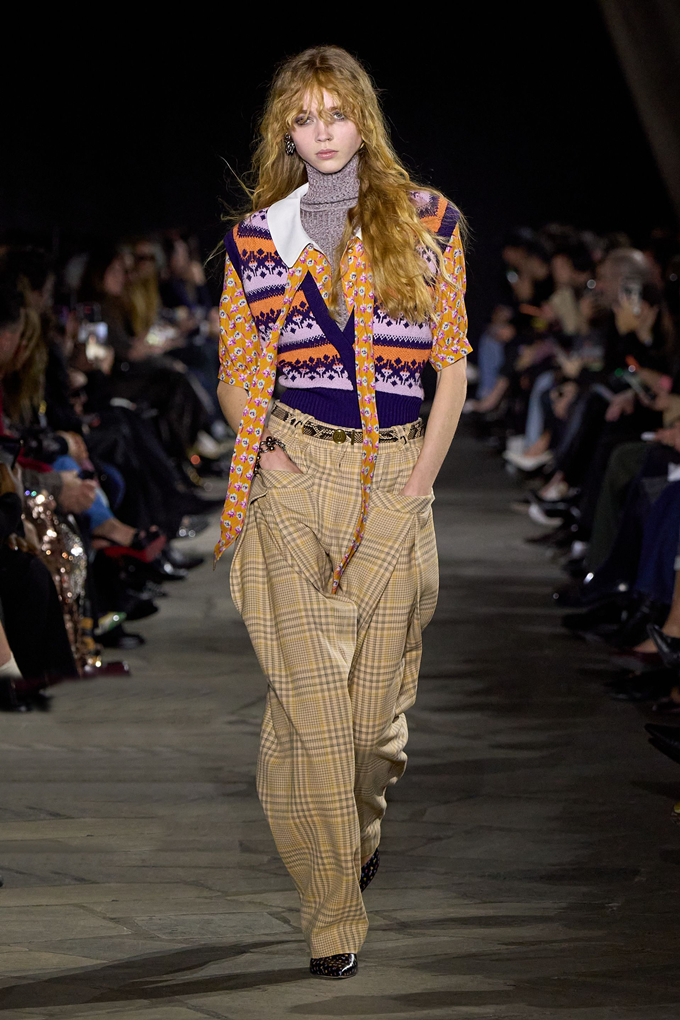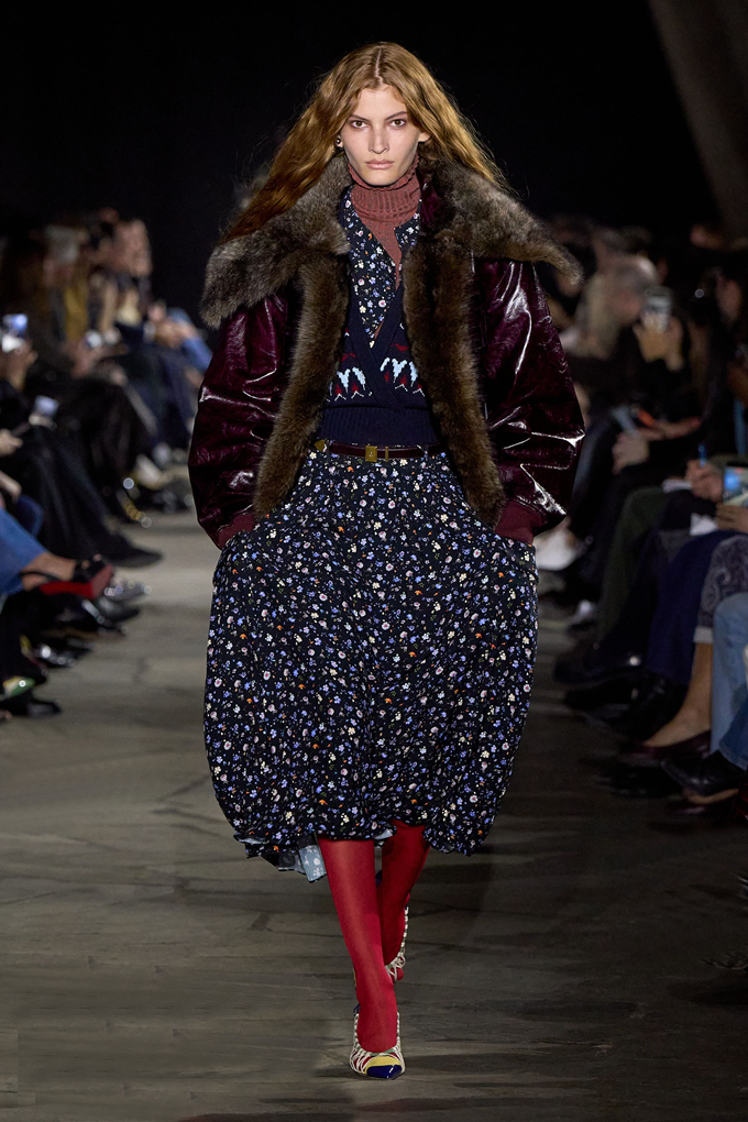 긴 꽃무늬 드레스는 하이브리드 재킷, 빈티지한 집업 점퍼와 짝을 이루고, 피터팬 칼라의 연노란색 긴 드레스는 보라색과 오렌지색 기하학적 패턴의 점퍼, 또는 카모플라주 프린트의 시어링 가죽 코트와 레이어링했다.
