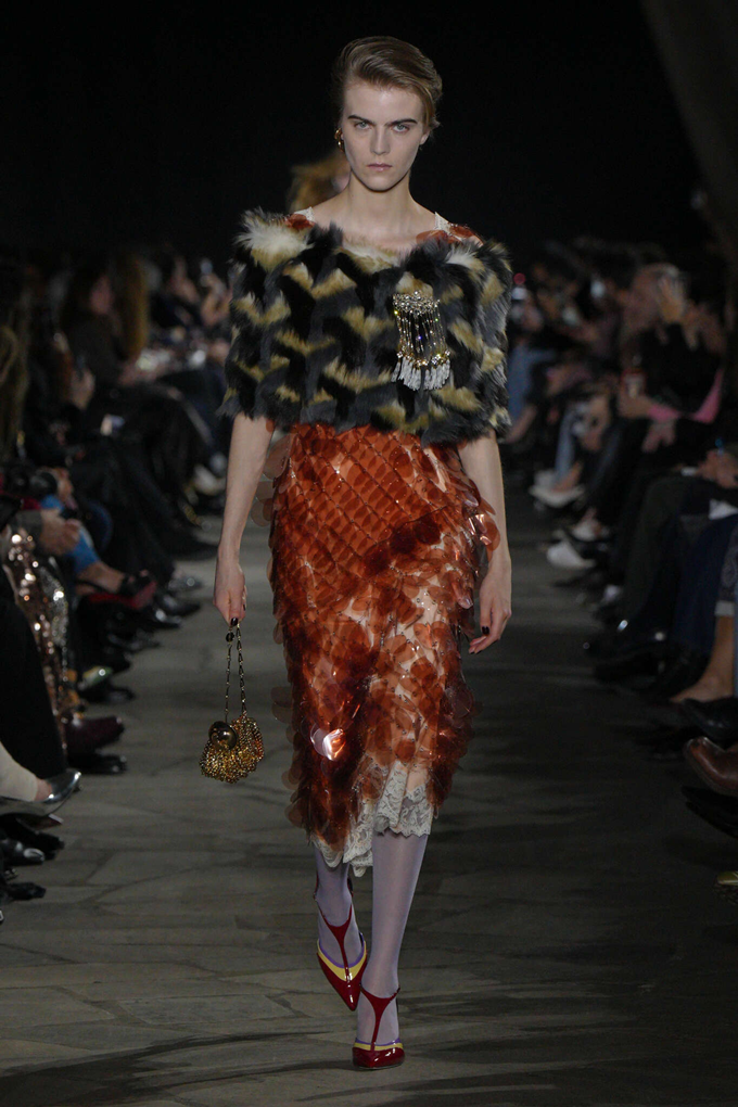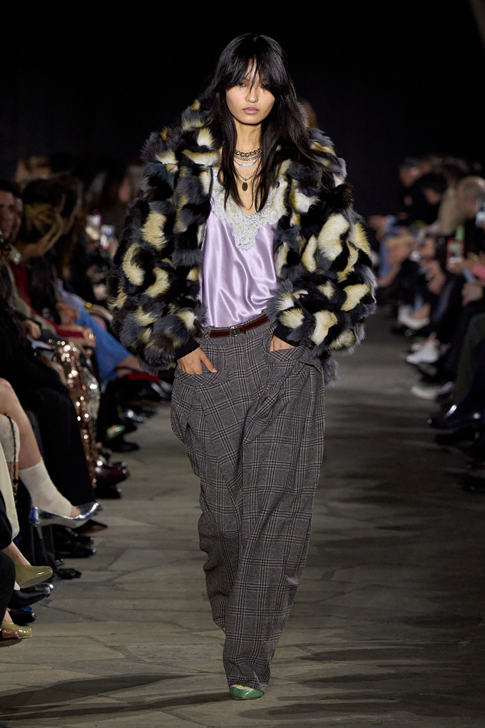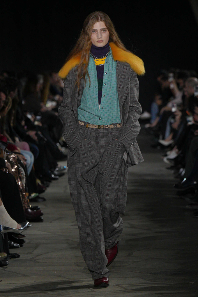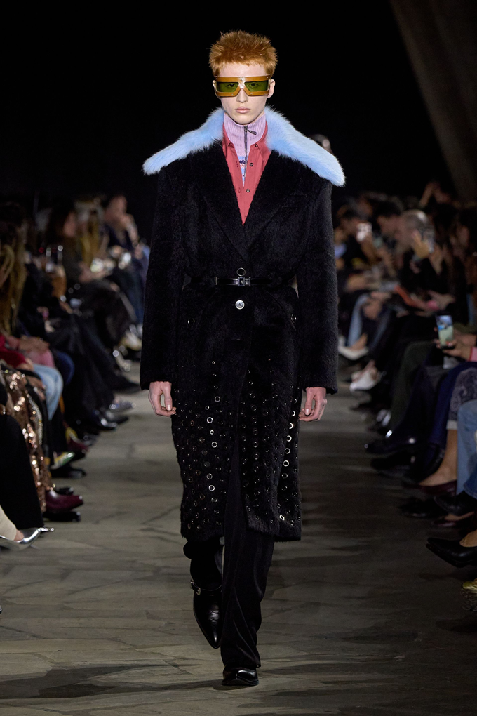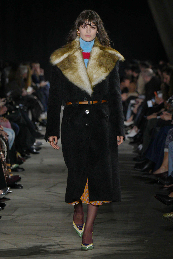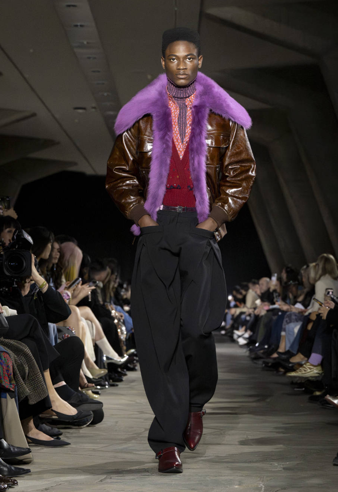 달콤한 핑크, 청록색, 애니멀, 줄무늬 패턴의 모피는 코트와 가죽 재킷의 칼라에 적용되었고, 더욱 예상치 못한 방식으로 정장 재킷에도 사용되었다.