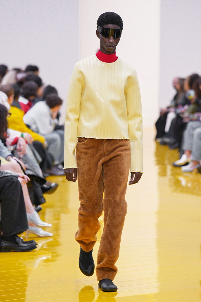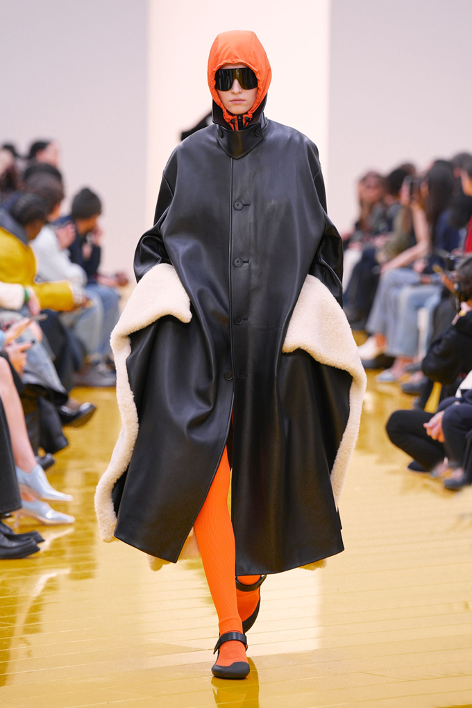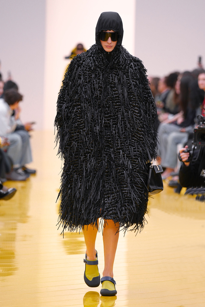 아우터와 가죽 레인코트는 공기를 주입하여 부풀린 채널을 만들며 감각적인 충격을 안겨주고, 원색의 가죽 미니드레스, 구조적인 블레이저, 사선 스커트는 마치 몸에서 분리된 듯한 라인을 만들고 프린지, 숨겨진 패널, 주름 디테일은 의상에 움직임을 더했다.