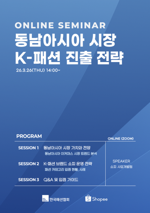 한국패션협회(회장 성래은)는 동남아시아 최대 이커머스 플랫폼인 쇼피 코리아와 함께 오는 3.26(목) 오후 2시, ‘동남아시아 시장, K-패션 진출 전략’ 웨비나를 개최한다.