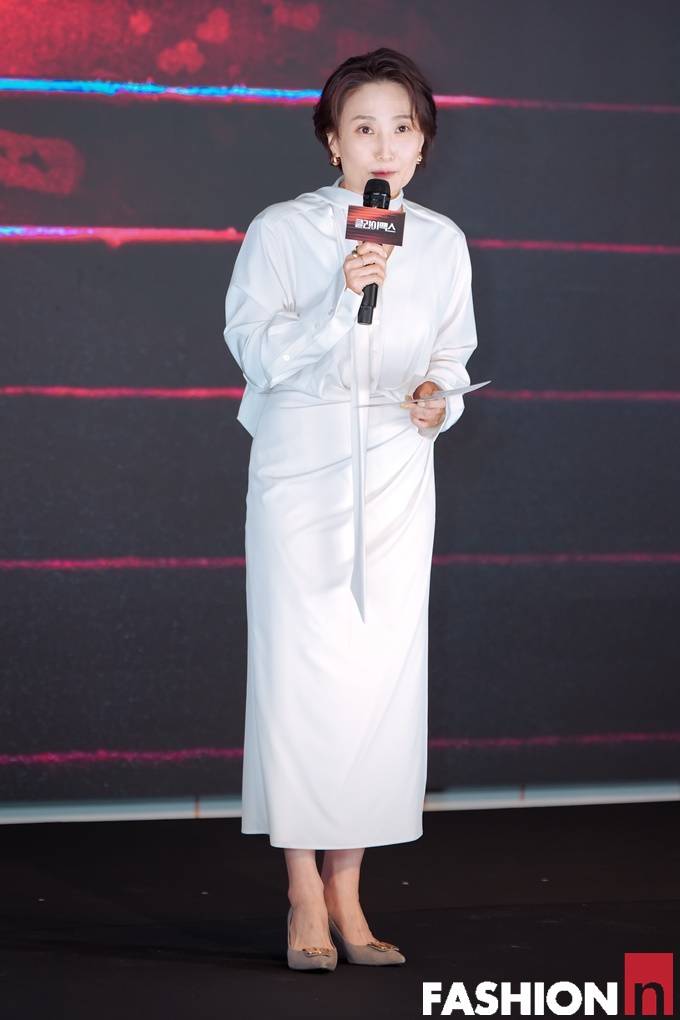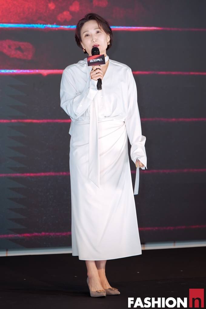 방송인 박경림이 화이트 드레이핑 원피스룩으로 상큼한 분위기의 우아한 MC룩을 연출했다.