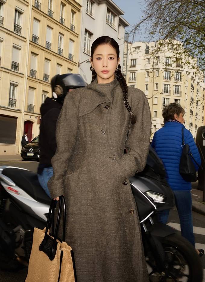 배우 기은세가 파리에서 구조적 테일러링 실루엣의 롱 코트룩으로 클래식하면서도 우아한 분위기를 자아냈다.