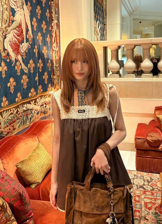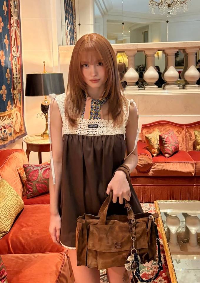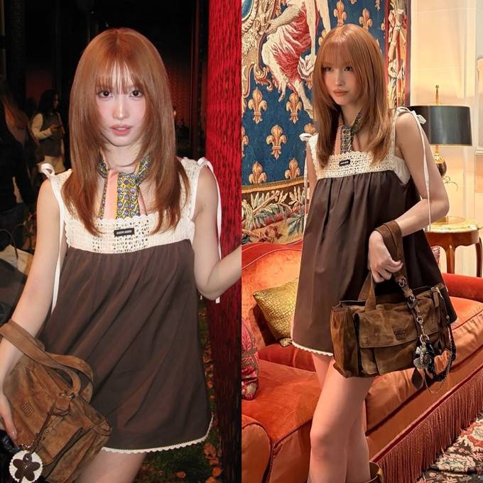 공개한 사진에서 모모는 아이보리 컬러 니트 패널과 레이스 디테일이 더해진 브라운 컬러의 미니 드레스룩으로 발랄하면서도 레트로 무드의 스타일링을 완성했다.