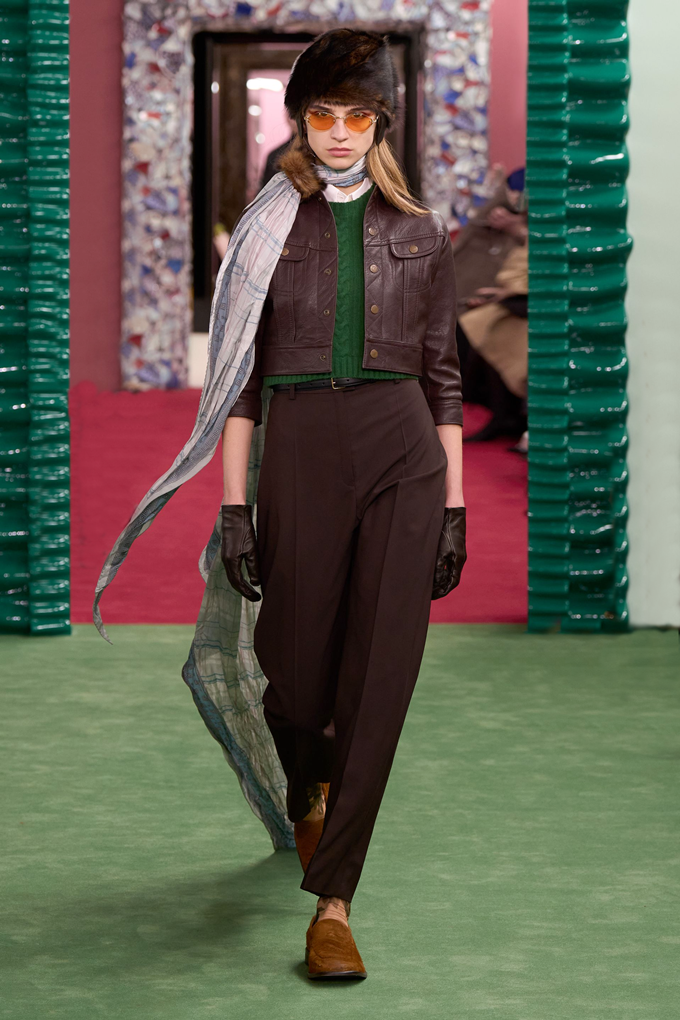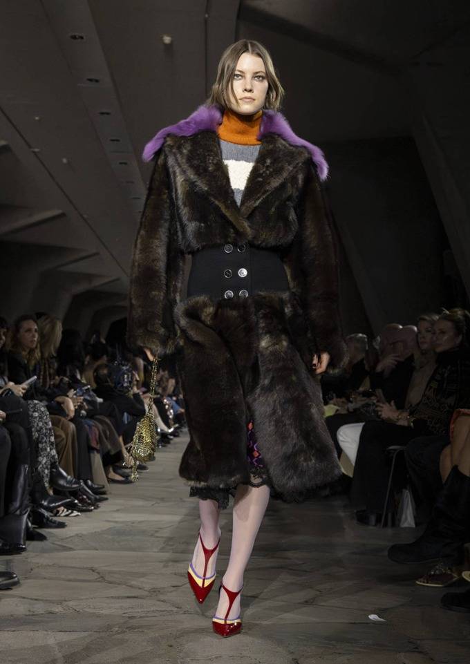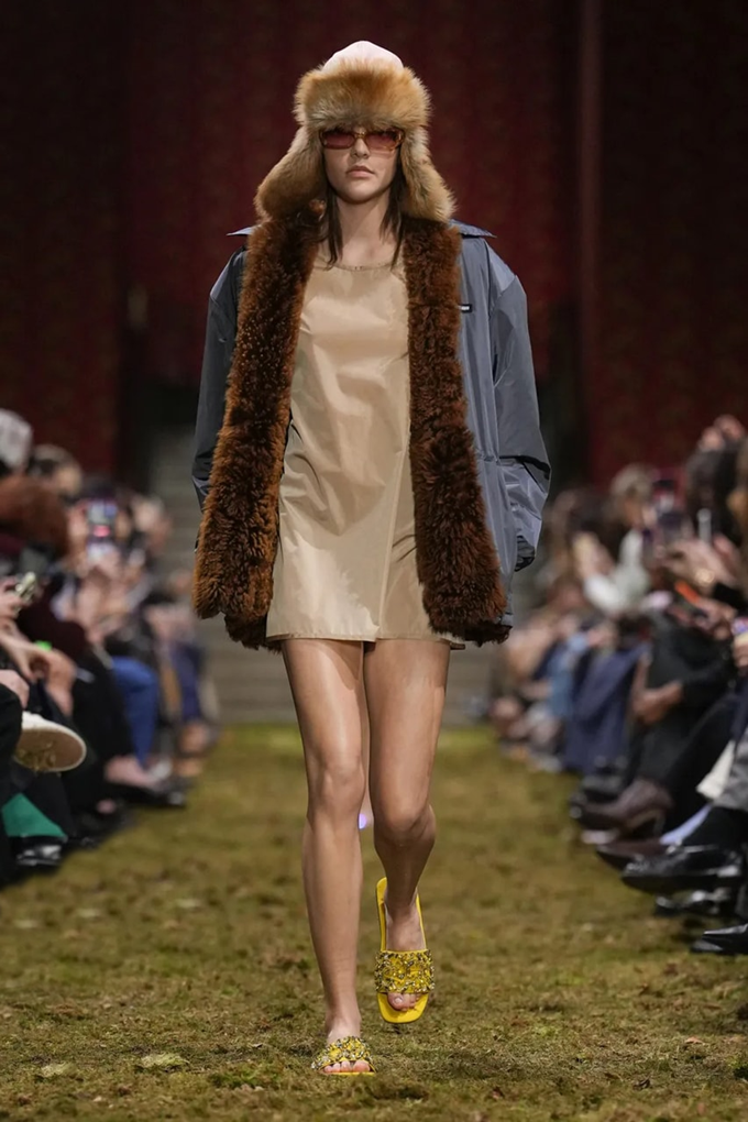 미우 미우는 풍성한 퍼 소재의 흔히 ‘군밤장수 모자’로 불리는 방한용 모자 트루퍼 햇을 대거 선보였다. 귀를 덮는 덮개가 달린 트루퍼 햇은 혹한 속에서 말을 타던 병사들이 체온을 유지하기 위해 착용하던 모자에서 유래했다.