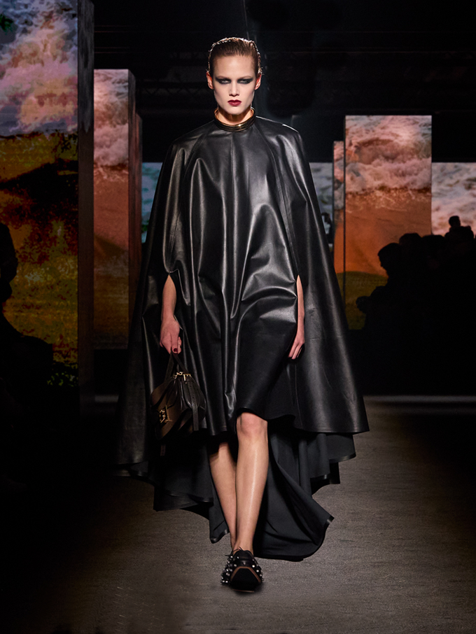 가죽 특유의 광택감과 부드럽게 흐르는 듯한 유려한 테일러링의 고급스러운 가죽 드레싱도 다양한 수공기법을 접목해 강렬한 존재감을 발산했다.