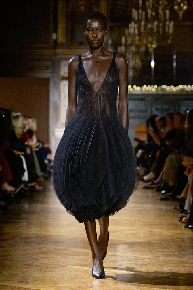 라반은 종이처럼 얇은 밀푀유 패널을 시그니처로 삼아 스커트와 드레스에 볼륨감 넘치는 프린지 가닥으로 입체감을 불어넣으며 드라마틱한 실루엣을 부여했다.