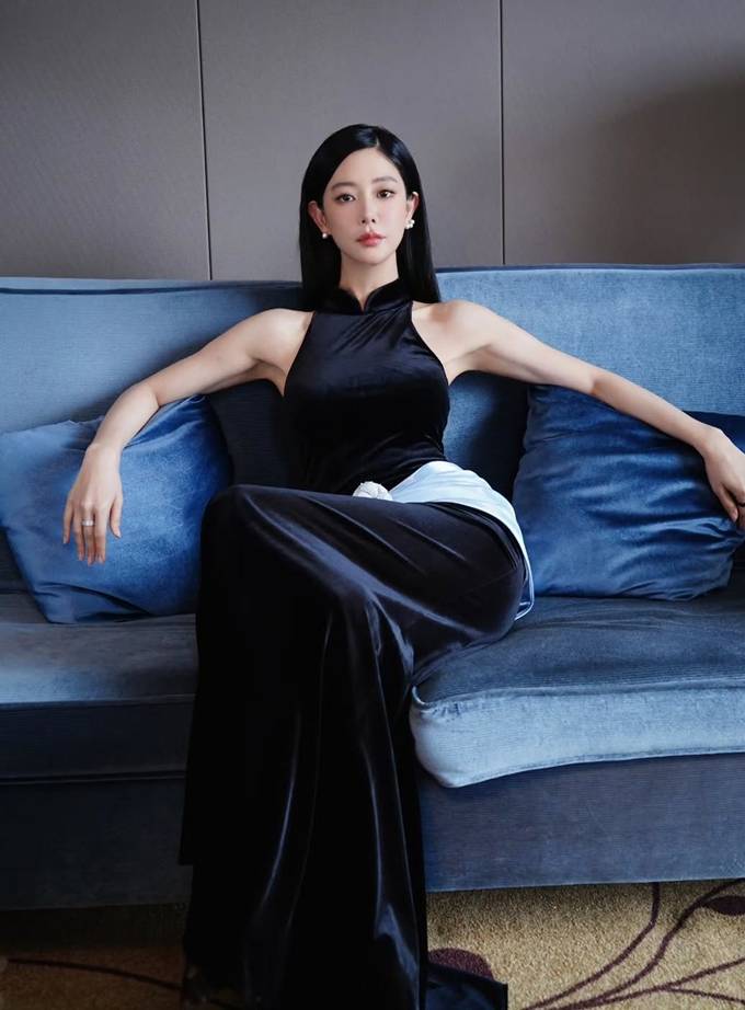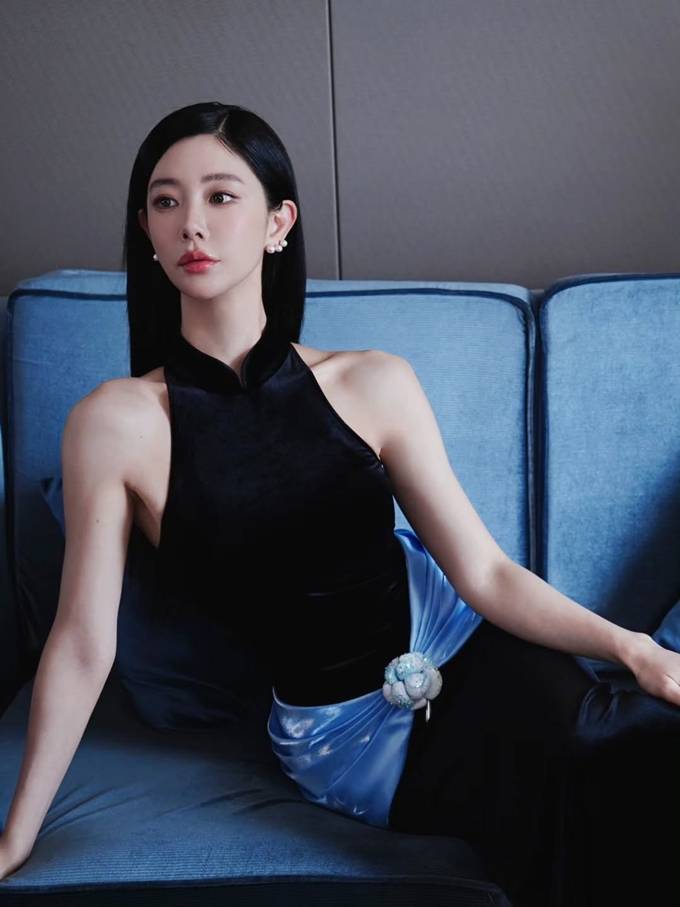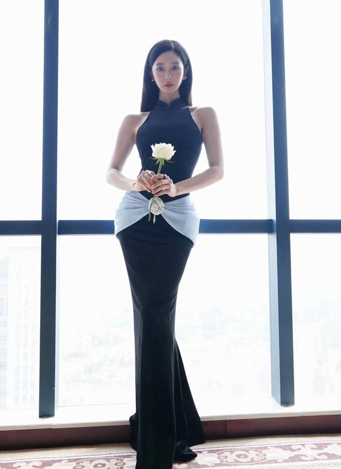 특히 허리 부분에 두른 은은한 파스텔 블루 컬러의 드레이프 장식이 더해져 블랙 드레스에 포인트를 더했다.