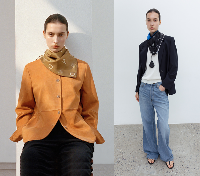 이번 시즌 스카프는 목에 두르는 것을 넘어 네크리스처럼 자연스럽게 늘어뜨리고 터틀넥처럼 목 위까지 감싸기도 하며 룩에 자유로운 리듬감을 더한다.