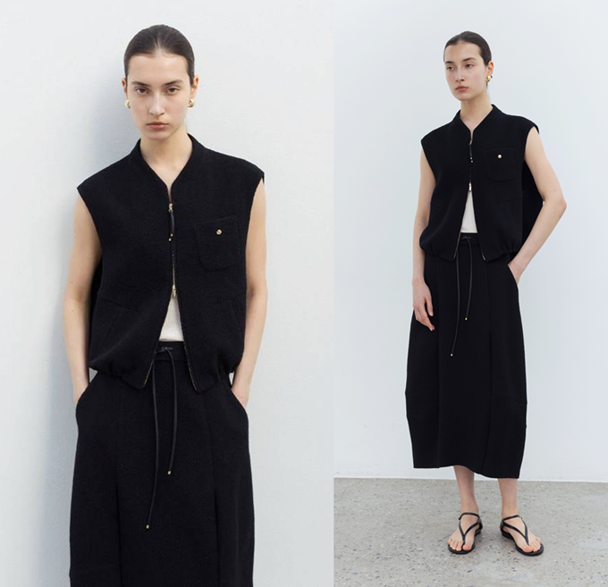 '쁘렝땅' 집업 베스트는 엠보 텍스처의 볼륨감이 느껴지는 자카드 소재를 사용했으며 깔끔한 테일러링으로 셔츠를 입지 않아도 충분히 갖춰 입은 느낌을 부여한다.