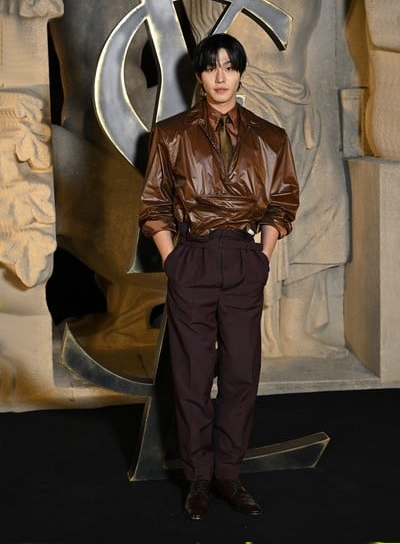 27. 그룹 보이넥스트도어(BOYNEXTDOOR) 태산은 파리 패션위크 2026 F/W 꾸레주 컬렉션에서 레드 터틀넥과 클래식한 가죽 재킷을 매치한 레더룩을 선보였다.