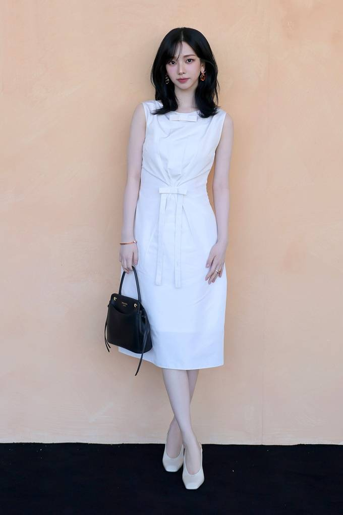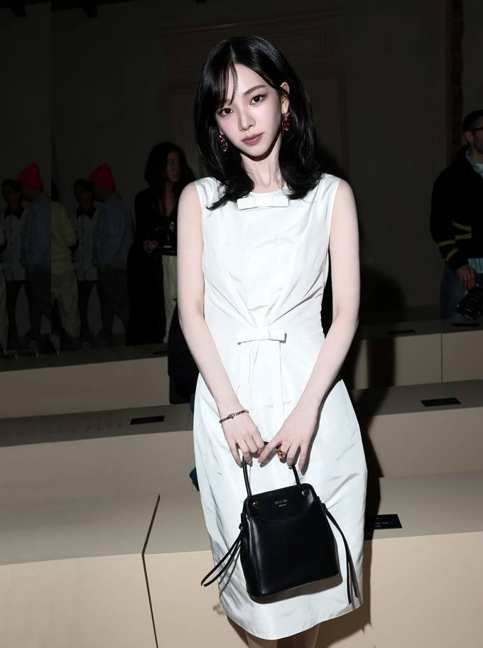 14. 에스파 카리나는 밀라노 패션위크 2026 F/W 프라다 패션쇼에서 리본 디테일의 파유 드레스룩으로 청순하면서도 우아한 분위기를 완성했다.