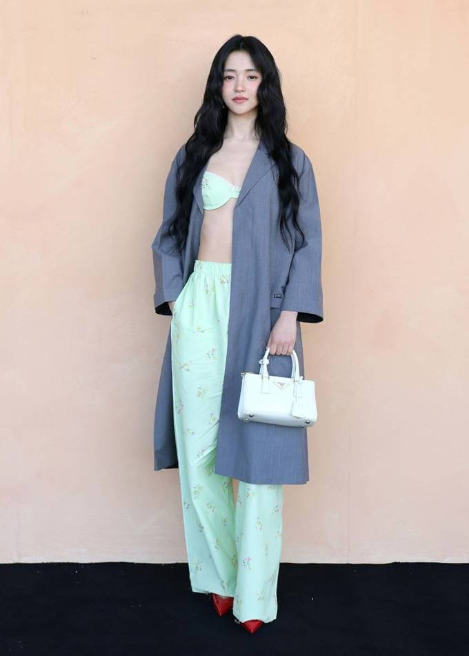 15. 배우 김태리는 밀라노 패션위크 2026 F/W 프라다 쇼에서 싱글 브레스트 재킷과 플로럴 패턴의 브라탑과 파자마 팬츠를 매치한 파격적인 로맨틱한 룩을 연출했다.