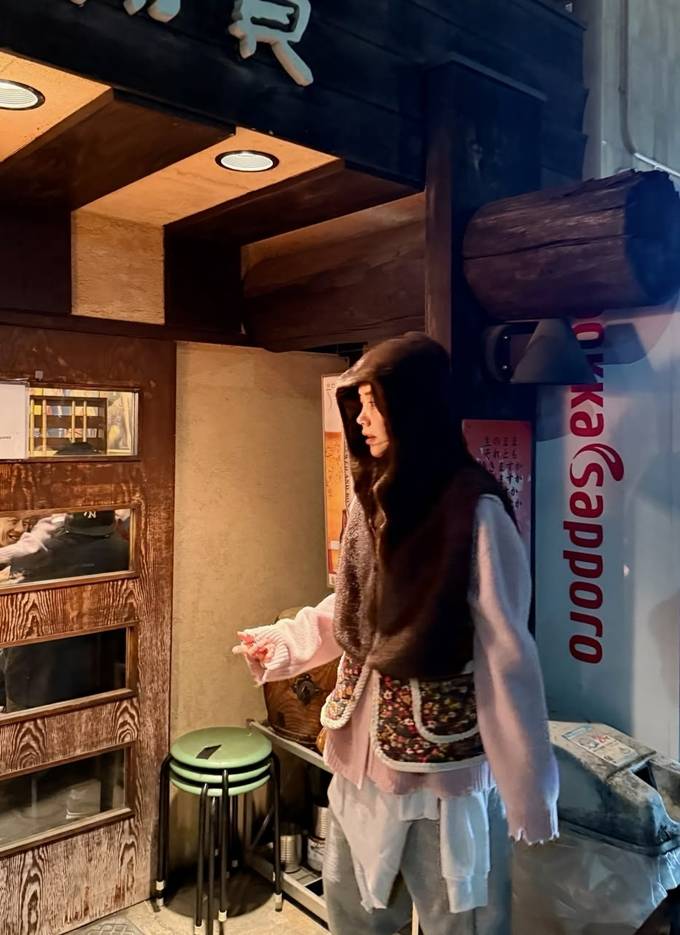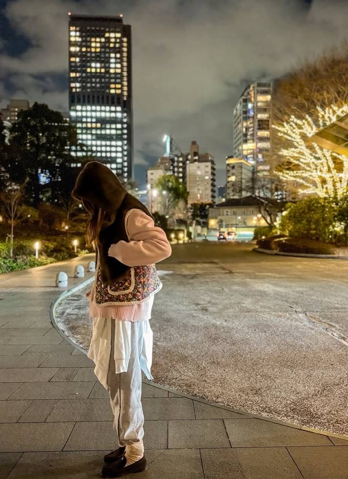 배우 채정안이 도쿄에서 니트 위에 할머니 조끼와 후드 퍼 조끼를 레이어드 스타일로 따뜻하면서도 스타일리시한 밤 산책룩을 선보였다.