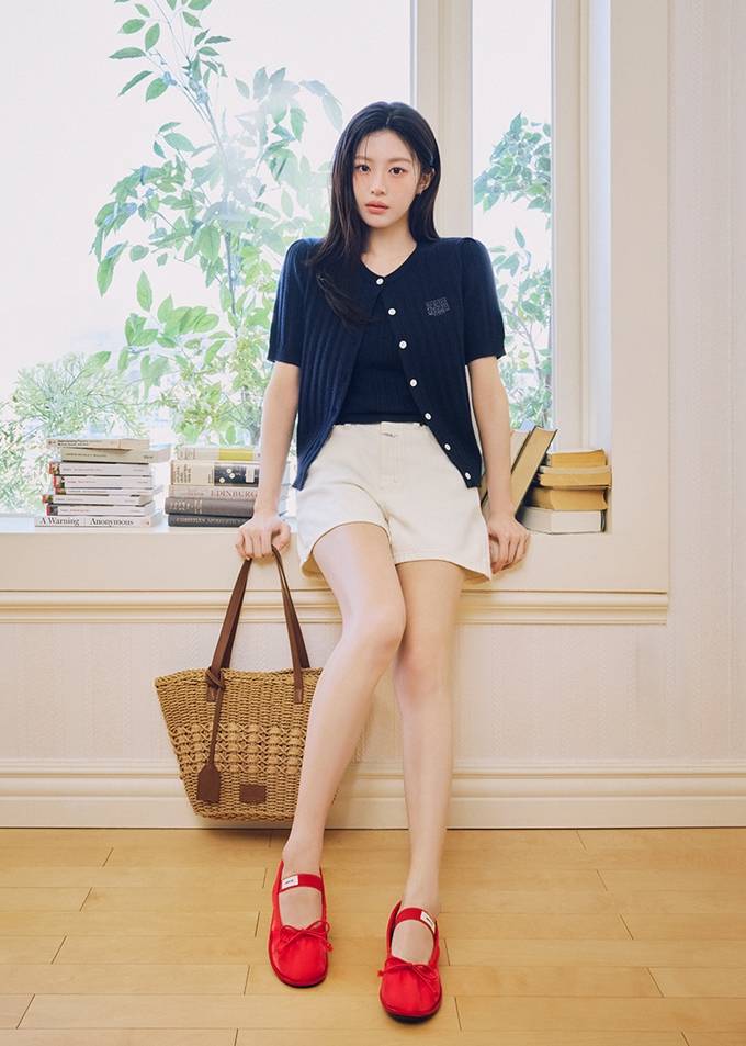 고윤정은 케이블 조직의 하프 니트 카디건 셋업과 화이트 데님 쇼츠, 레드 포인트의 리본 플랫 슈즈를 매치한 스타일링으로 클래식하면서도 청순한 분위기를 자아냈다.