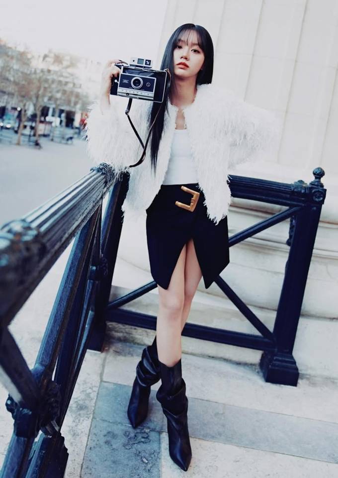 또 다른 컷에서는 화이트 퍼 재킷과 블랙 미니스커트를 매치해 한층 더 드라마틱한 스타일링을 선보였다.