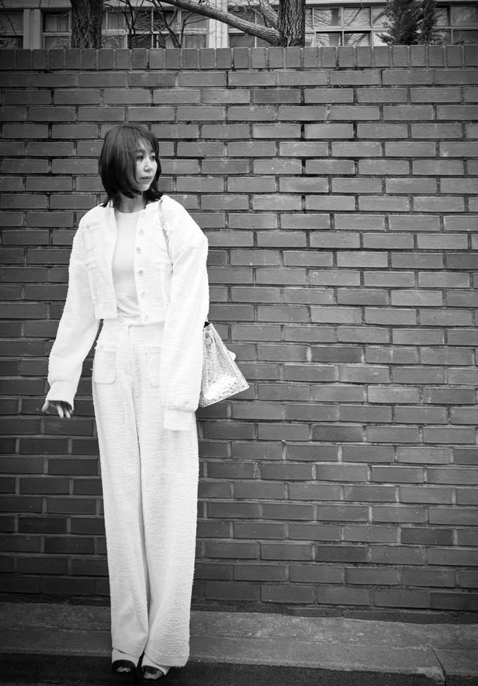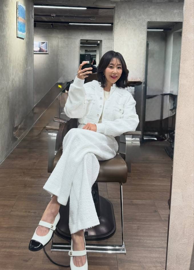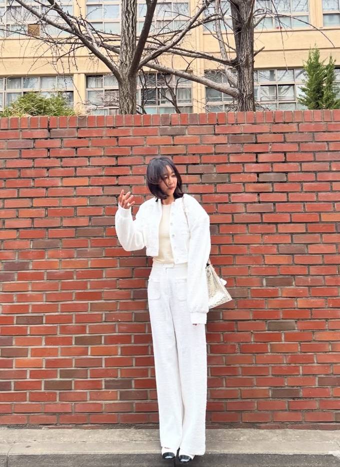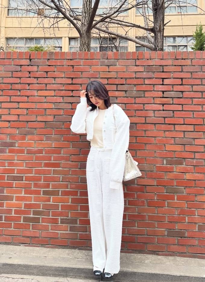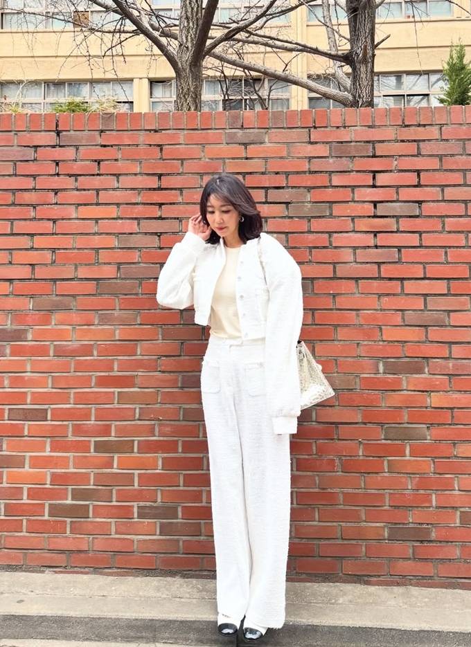 공개한 사진에서 전미라는 화이트 트위드 팬츠와 크롭 재킷에 아이보리 이너를 매치한 슈트룩으로 단아하면서도 시크한 분위기를 드러냈다.