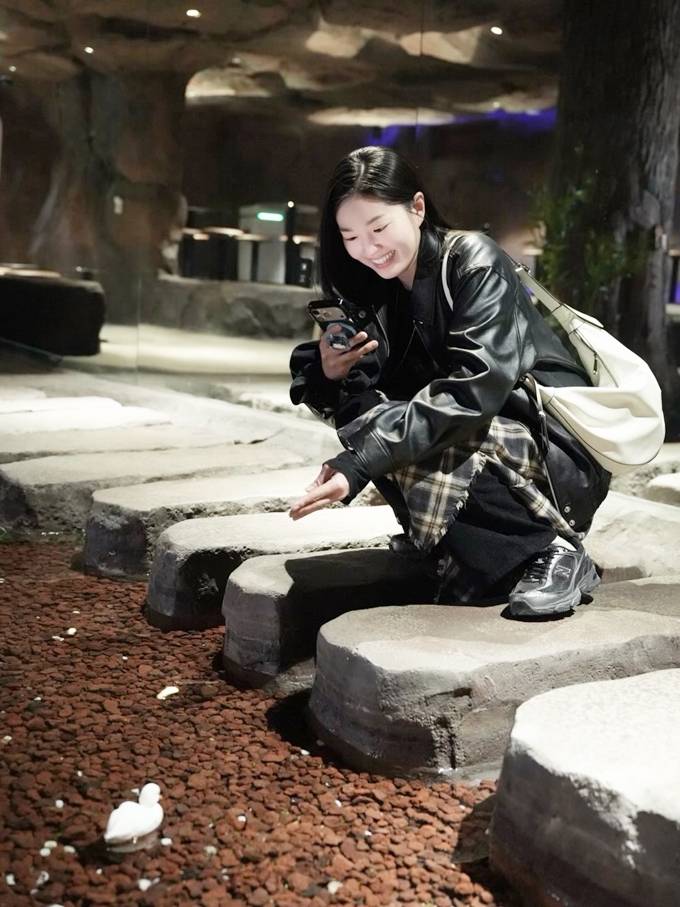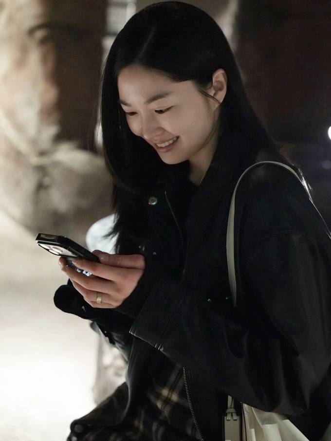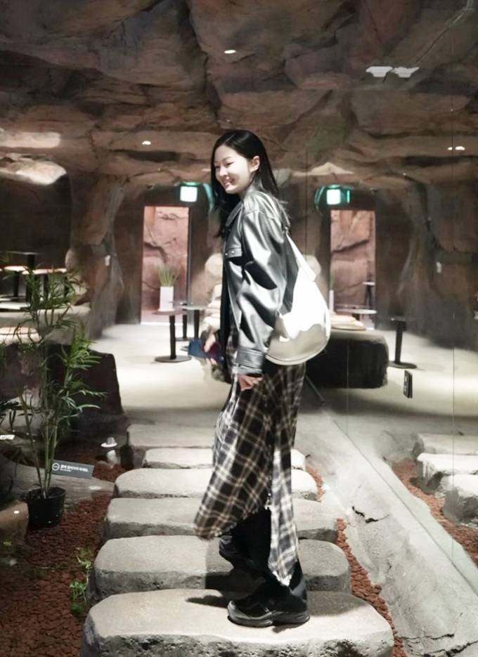 공개한 사진에서 류이서는 캐주얼 팬츠 위에 체크 스커트를 레이어드하고 가죽 재킷을 매치한 외출룩으로 밤 까페 데이트를 즐겼다.
