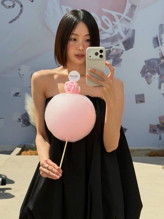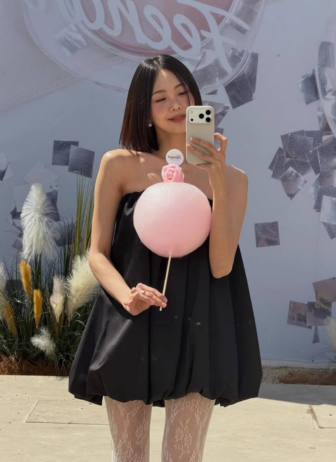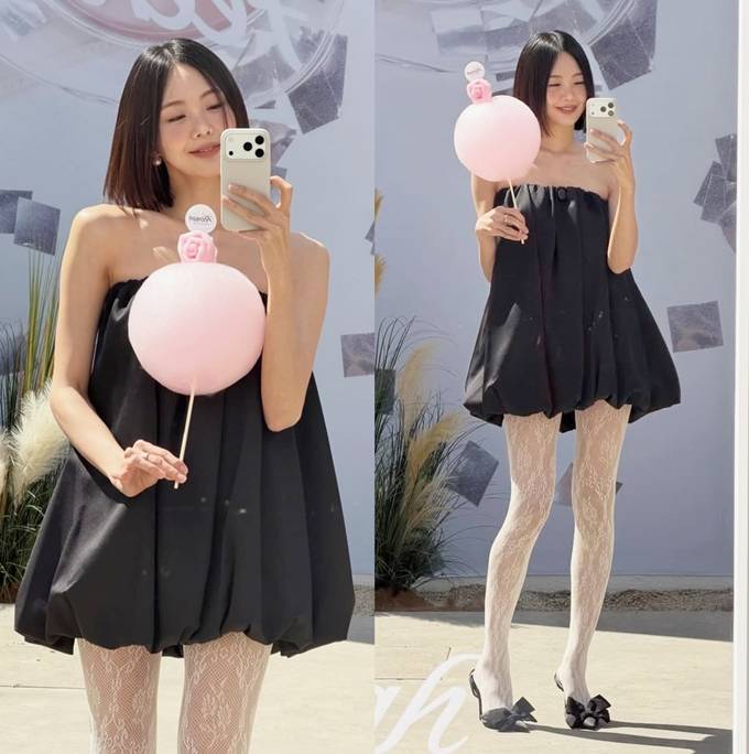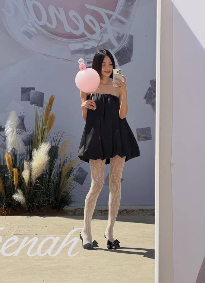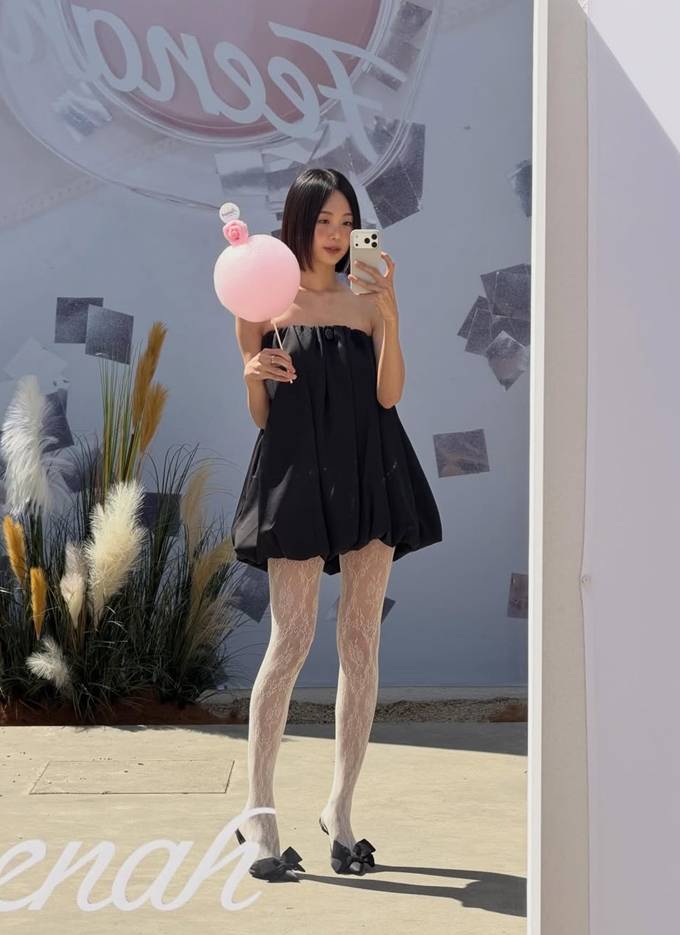 또한 핑크 컬러의 풍선을 활용한 센스 있는 스타일링은 룩에 위트를 더하며, 성수동 특유의 감각적인 분위기와도 자연스럽게 어우러졌다.