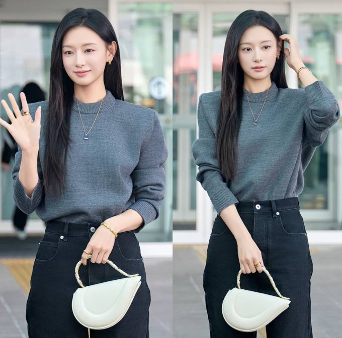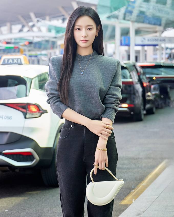 이 날 김지원은 그레이 니트 스웨터에 블랙 진을 매치한 심플하면서도 도회적인 룩에 불가리 주얼리를 포인트로 매치해 센스있는 공항 패션을 완성했다.