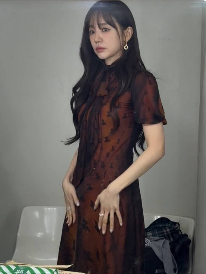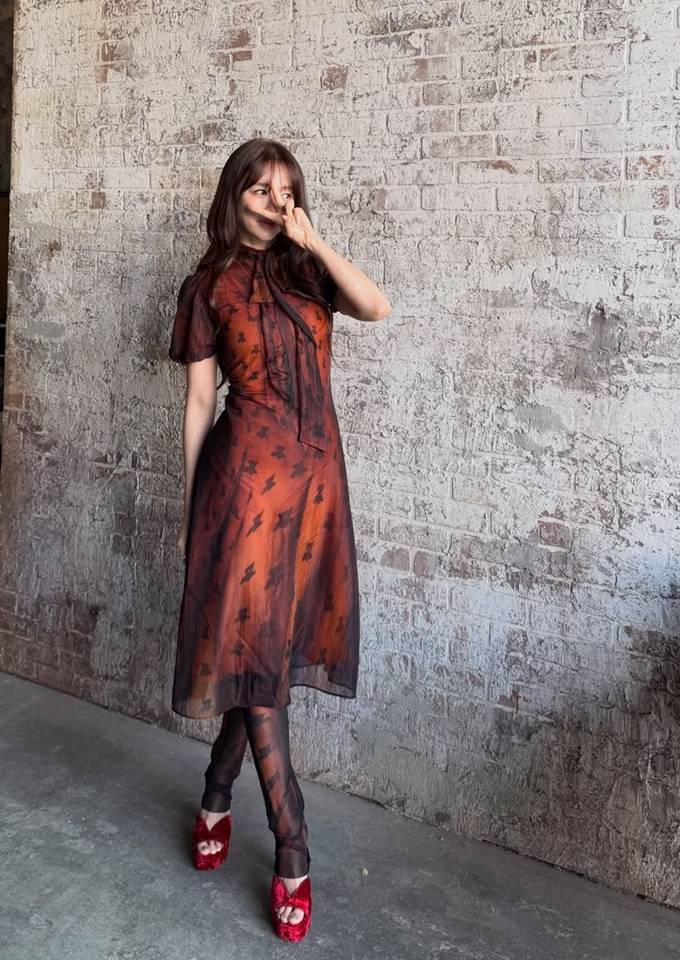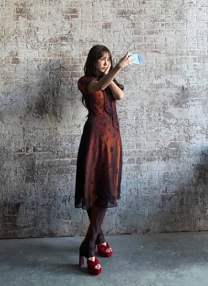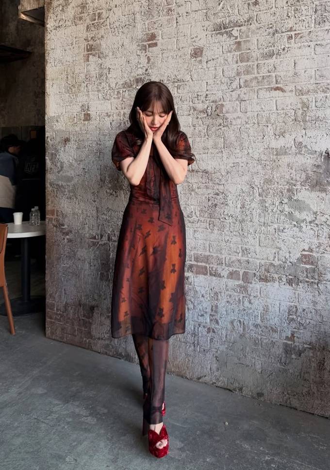 공개한 사진에서 윤은혜는 얇게 비치는 소재 위로 더해진 패턴 디테일과 레드 브라운 컬러의 시스루 원피스를 착용하고 우아하면서도 몽환적인 매력을 드러냈다. 특히 하이넥 디자인과 리본 디테일은 클래식한 분위기를 강조하며, 자연스럽게 떨어지는 실루엣은 체형을 부드럽게 감싸 여성스러운 라인을 완성했다.