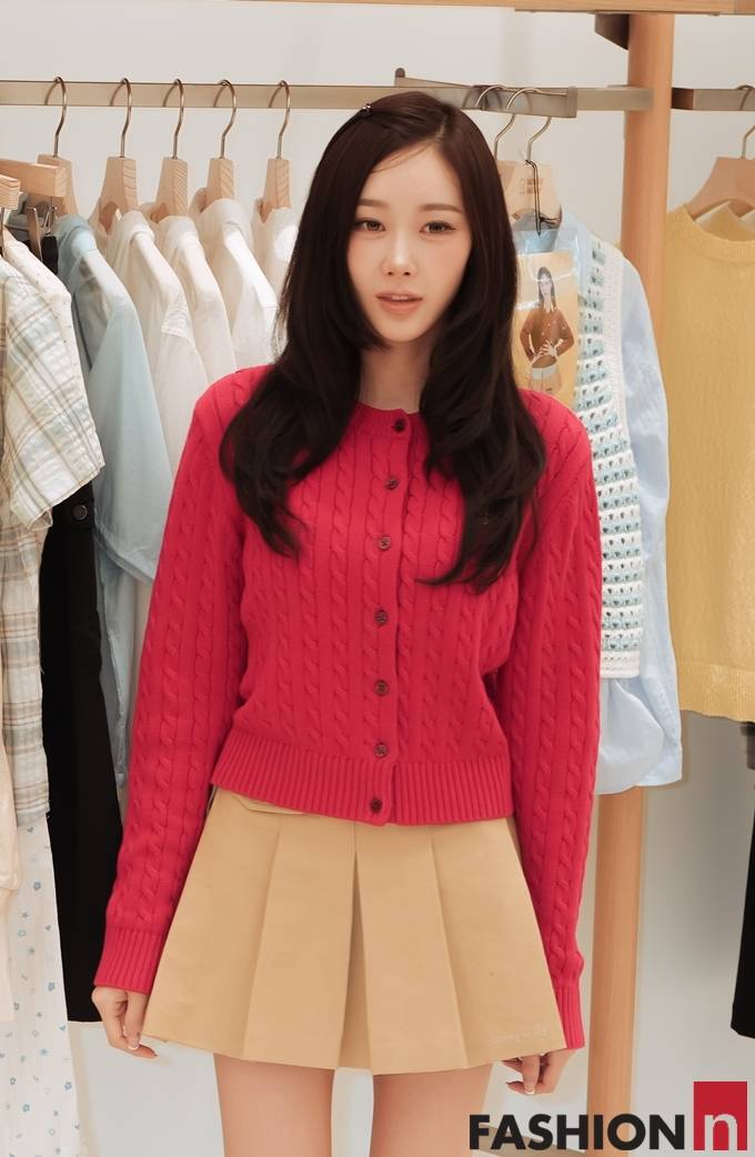 이날 지젤은 긴 웨이브 헤어 스타일에 레드 컬러의 케이블 니트 카디건과 베이지 플리츠 스커트를 매치한 프레피룩으로 화사하면서도 싱그러운 봄 패션을 선보였다. 완성했다.