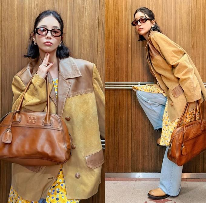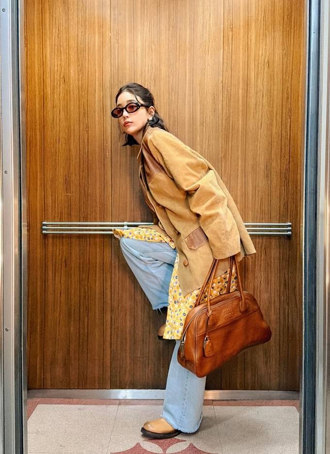 여기에 와이드 데님 팬츠를 레이어드해 트렌디한 실루엣을 강조하며, 클래식한 브라운 레더 백으로 전체 룩에 통일감을 더했다.