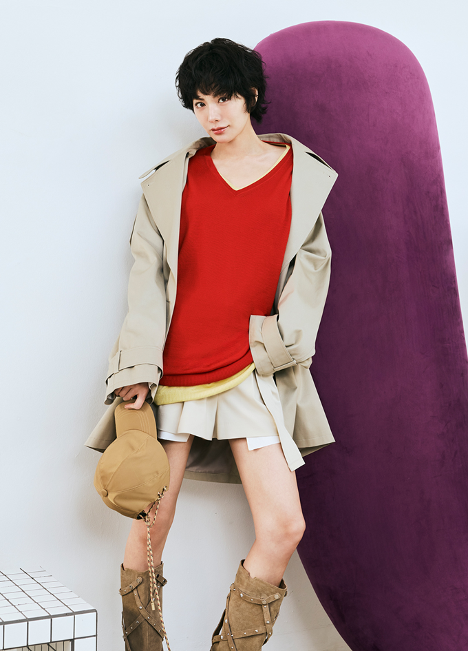 소매 끝과 밑단 시보리로 착용감이 뛰어난 트렌디한 크롭 봄버 재킷으로 나나처럼 스칸츠와 매치해 시크한 듯 여성미가 균형감을 이루는 레더 투피스룩을 연출한다.