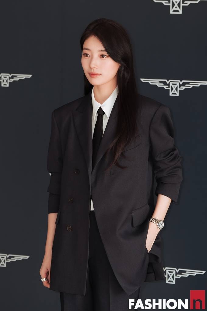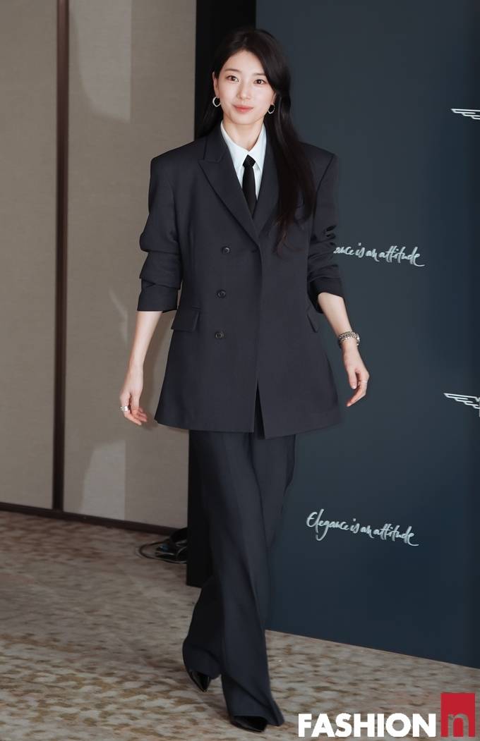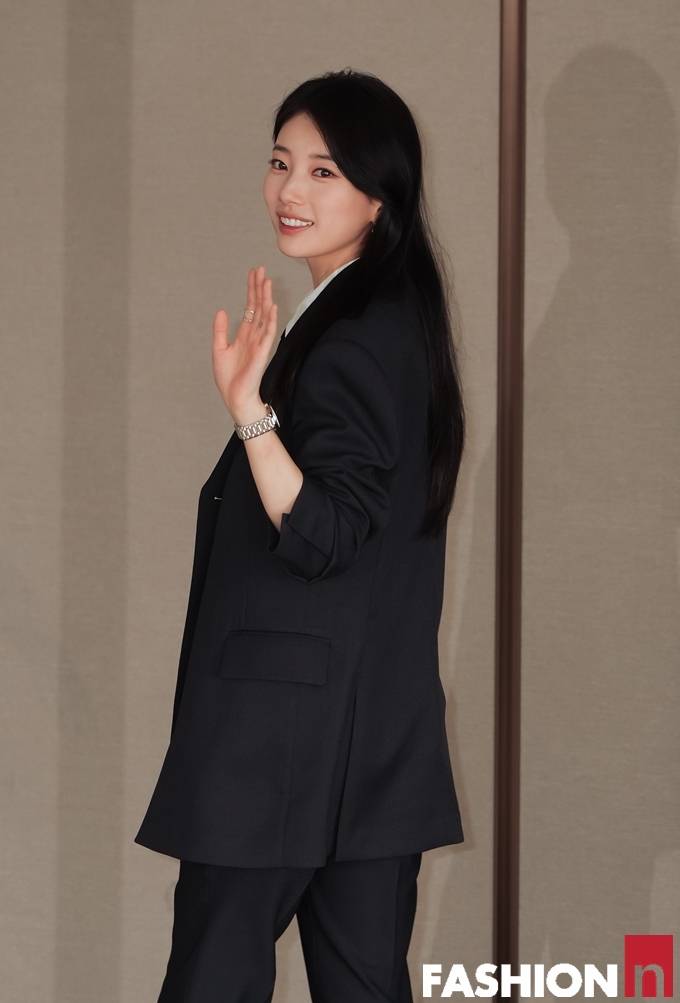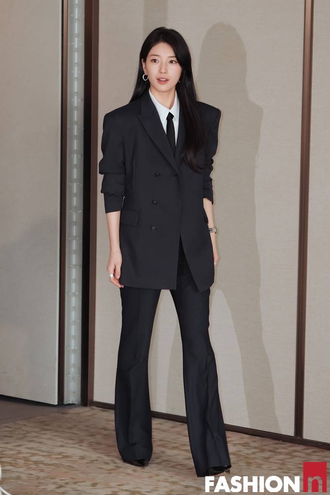 이날 수지는 롱 웨이브 생머리에 다크 네이비 상하의 셋업 슈트를 입고, 화이트 셔츠에 블랙 타이와 미니멀 액세서리 등을 매치한 나들이룩으로 러블리한 시크미를 발산했다.