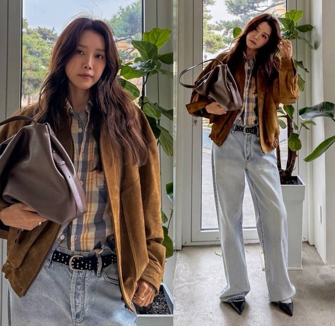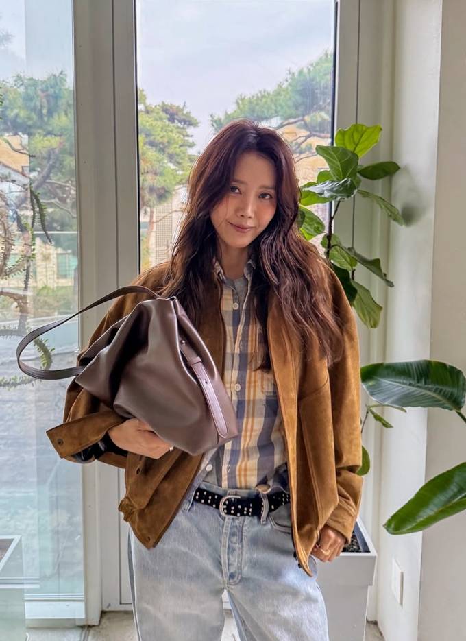 공개한 사진에서 채정안은 브라운 컬러의 오버핏 스웨이드 봄버 재킷을 중심으로 한 편안하면서도 스타일리시한 룩을 완성했다.