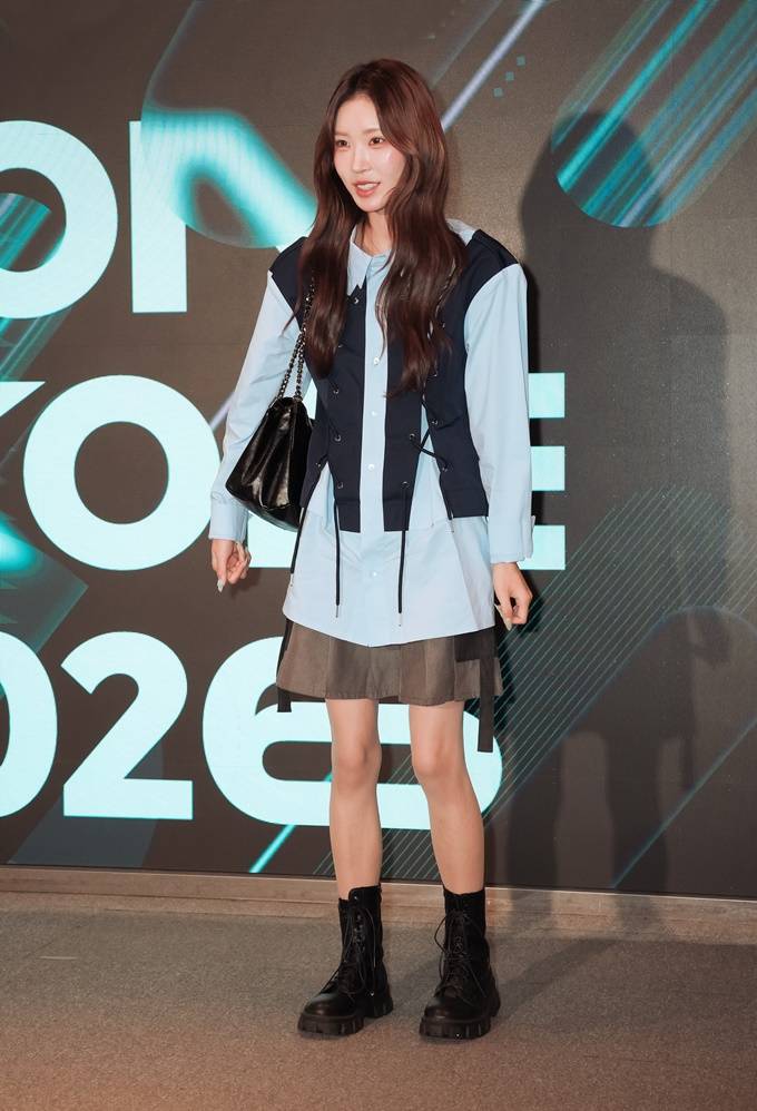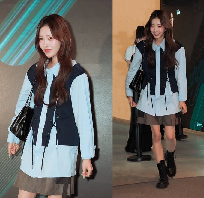 이날 최준희는 조끼 형태의 디자인이 프린트된 실험적인 셔츠 슈트룩으로 세련되면서도 당당한 카리스마를 발산했다.