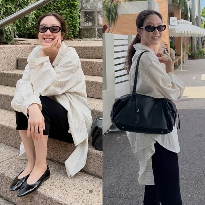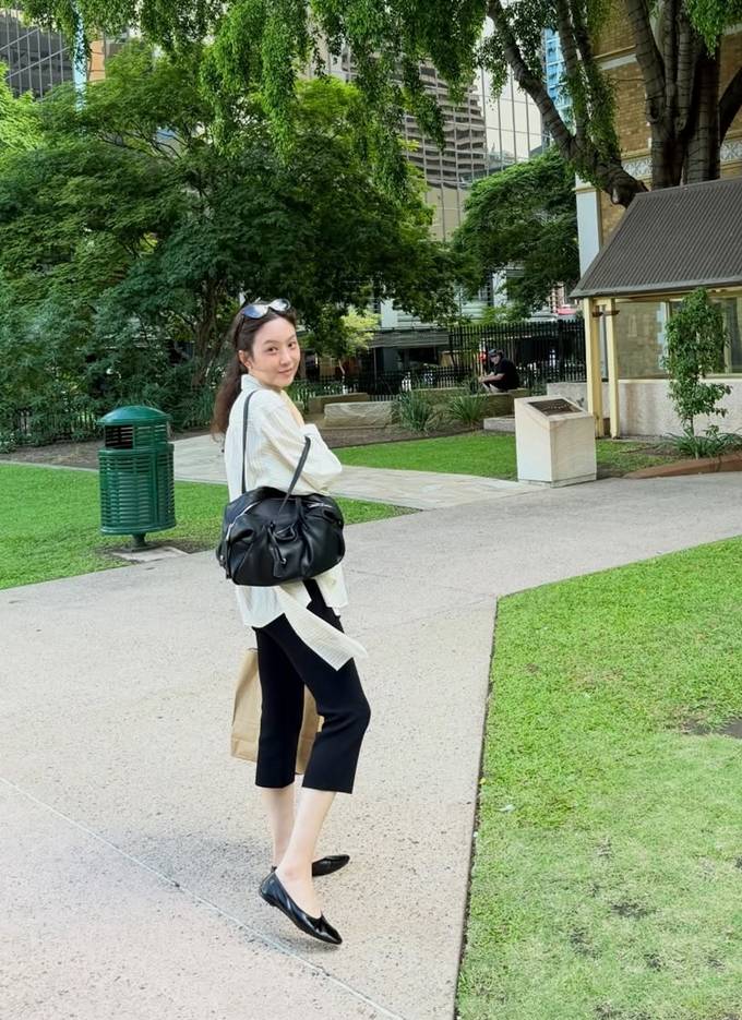여기에 블랙 팬츠를 매치해 전체적인 균형을 잡았고, 플랫 슈즈를 더해 활동성과 여성스러움을 동시에 챙겼다.