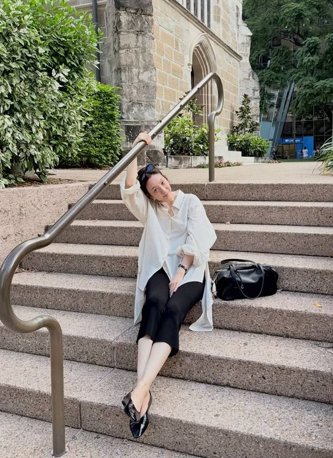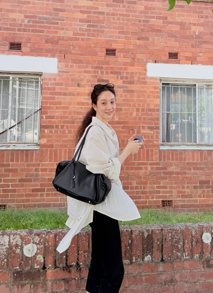 배우 정려원이 호주에서 루즈 핏 스트라이프 셔켓 산책룩으로 여유로운 분위기를 만끽했다.