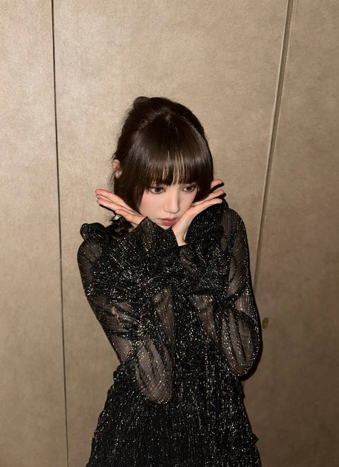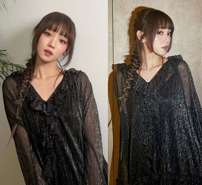 은은한 펄감이 돋보이는 블랙 시스루 드레스를 착용해 고급스러우면서도 몽환적인 무드를 완성했다.