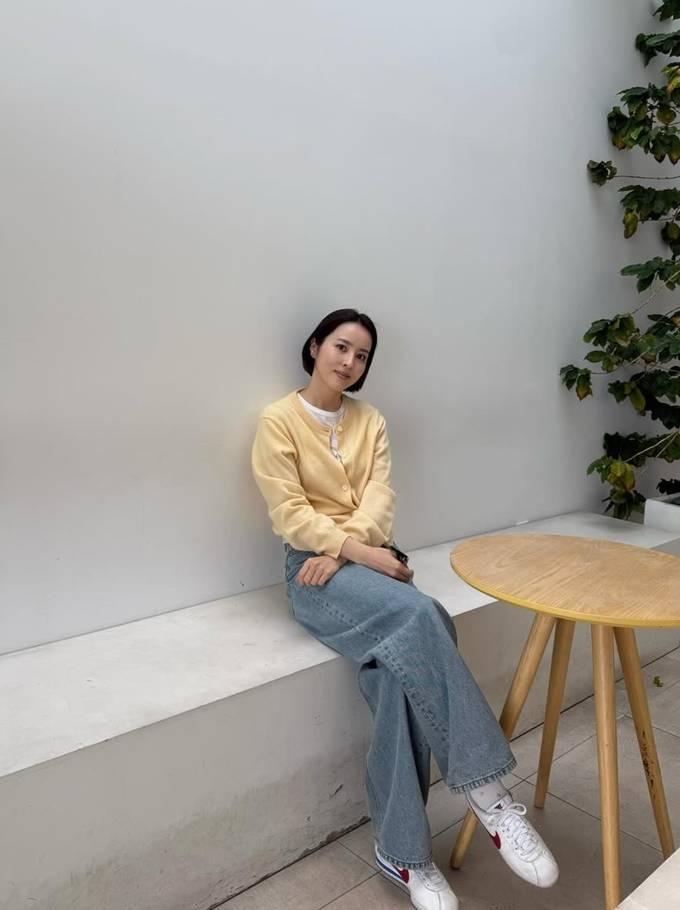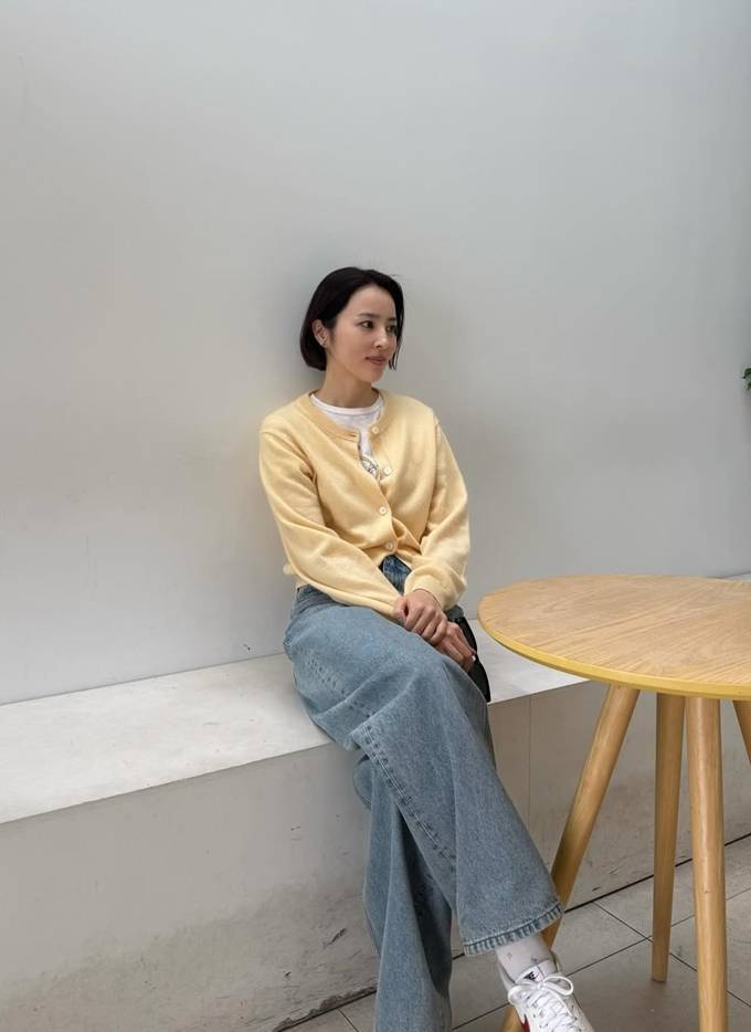 배우 한혜진이 숏컷 단발에 옐로 카디건을 착용한 여행룩으로 더 어려진 동안 미모를 발산했다.