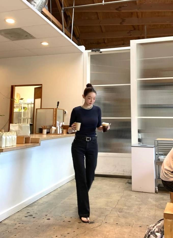공개한 사진에서 강민경은 바디라인을 자연스럽게 살려주는 슬림한 블랙 티셔츠에 하이웨이스트 데님을 매치해 간결하면서도 여성스러운 분위기를 연출했다.
