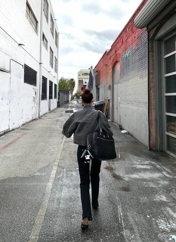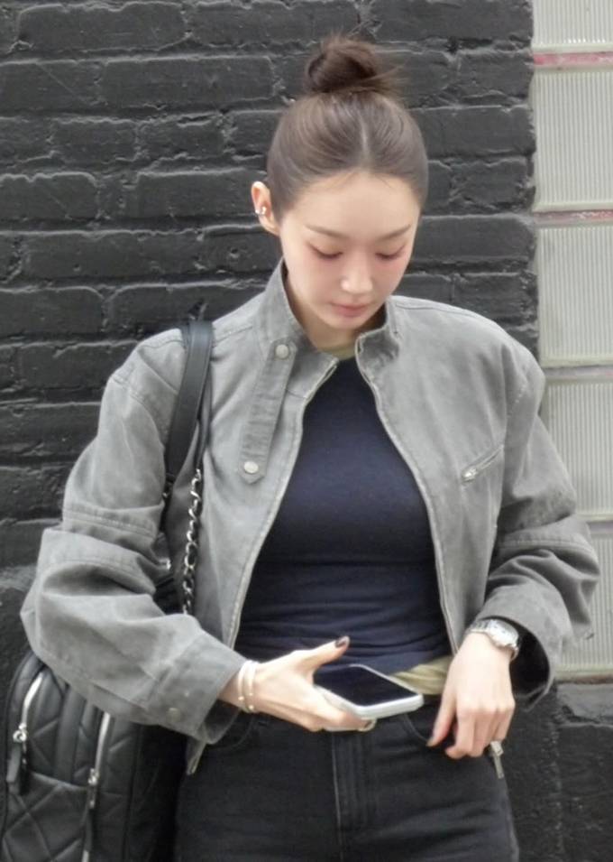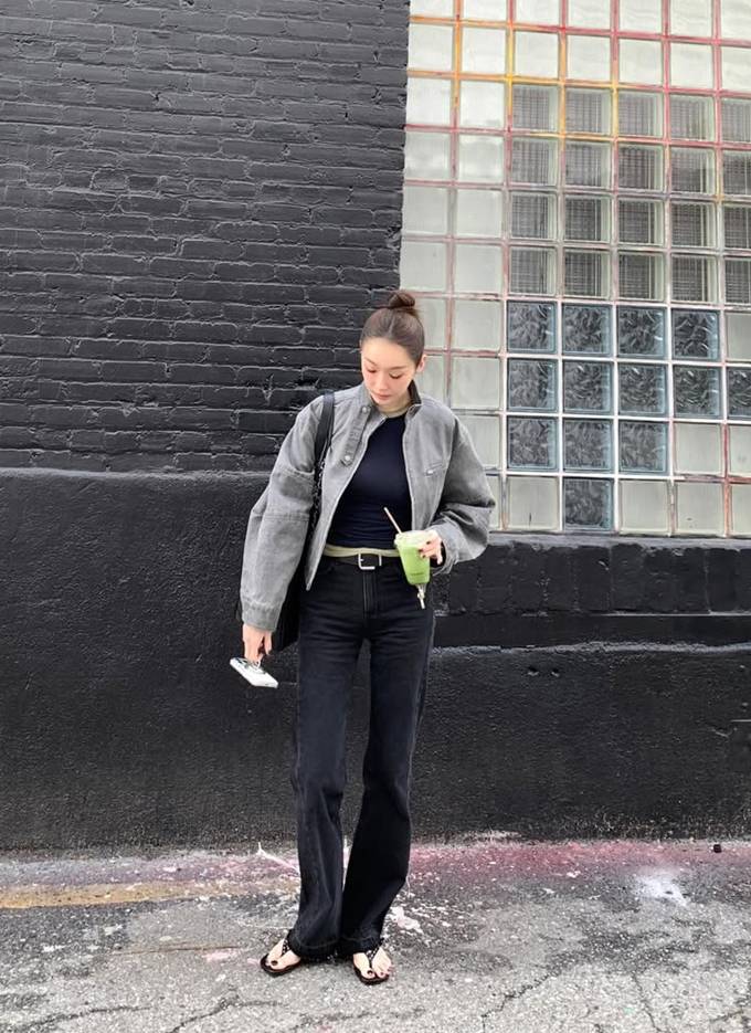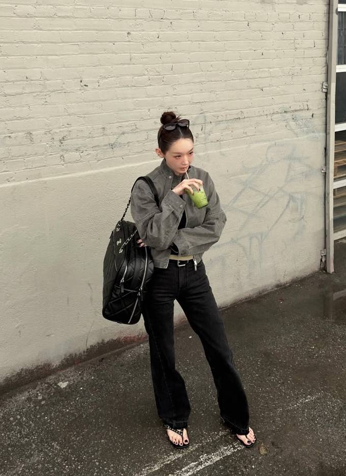 여기에 크롭 기장의 그레이 재킷을 매치해 한층 시크한 무드를 완성했다. 짧은 아우터와 길게 떨어지는 팬츠의 대비가 다리 라인을 더욱 길어 보이게 하는 효과를 가져왔다.