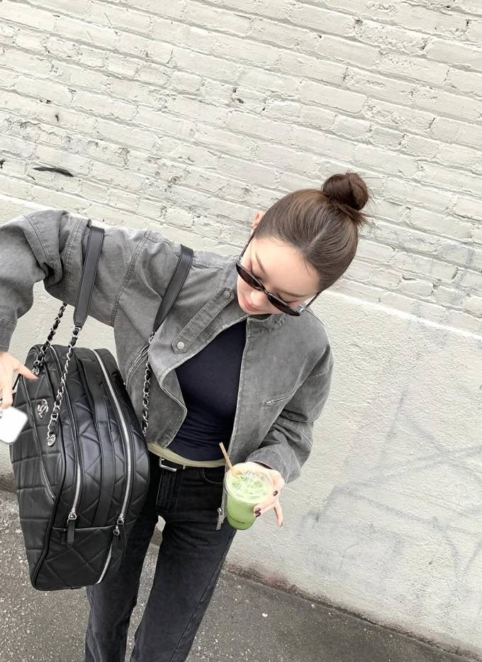 4. 4.‘강석우 딸’ 강다은, 아빠 재킷 입었나? 여리여리 오버핏 레더 재킷 봄 산책룩
