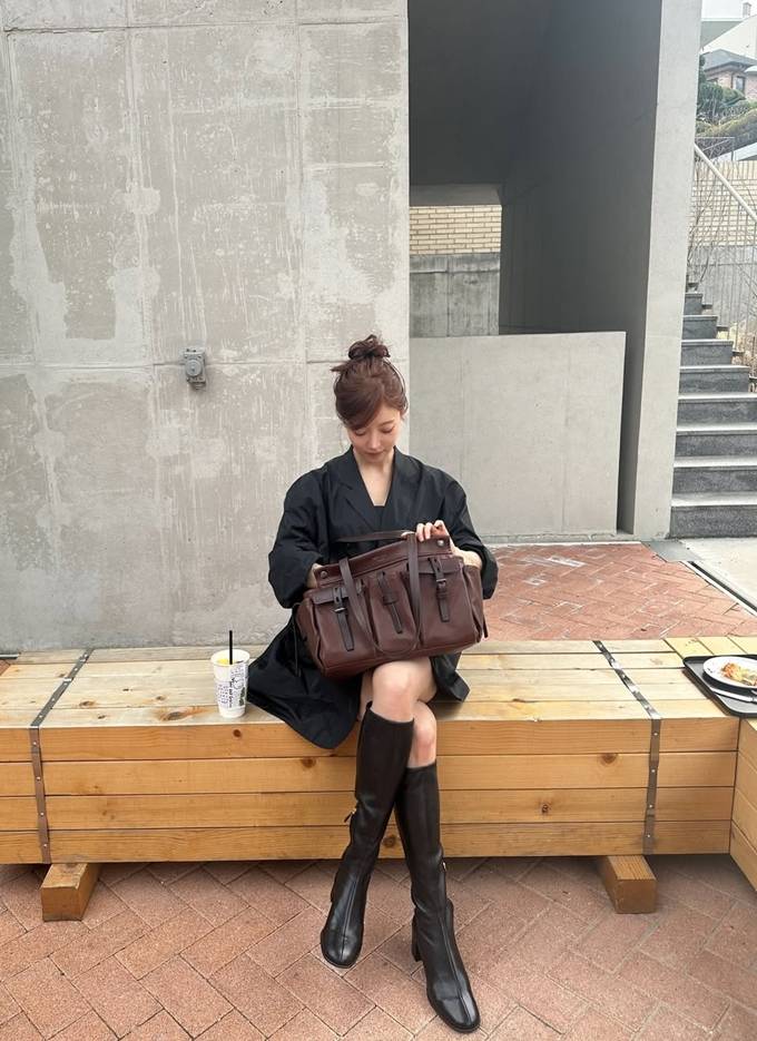 또 여기에 무릎 아래까지 올라오는 부츠를 더해 다리 라인을 길어 보이게 연출했다.