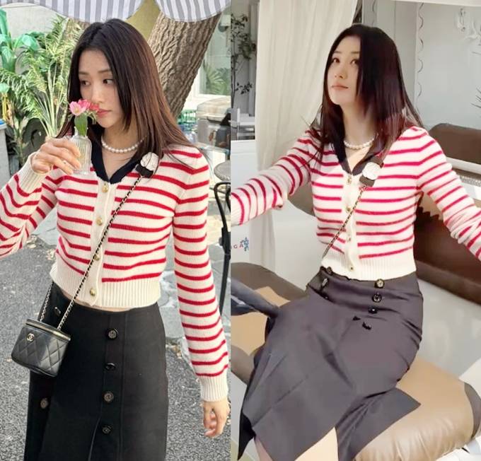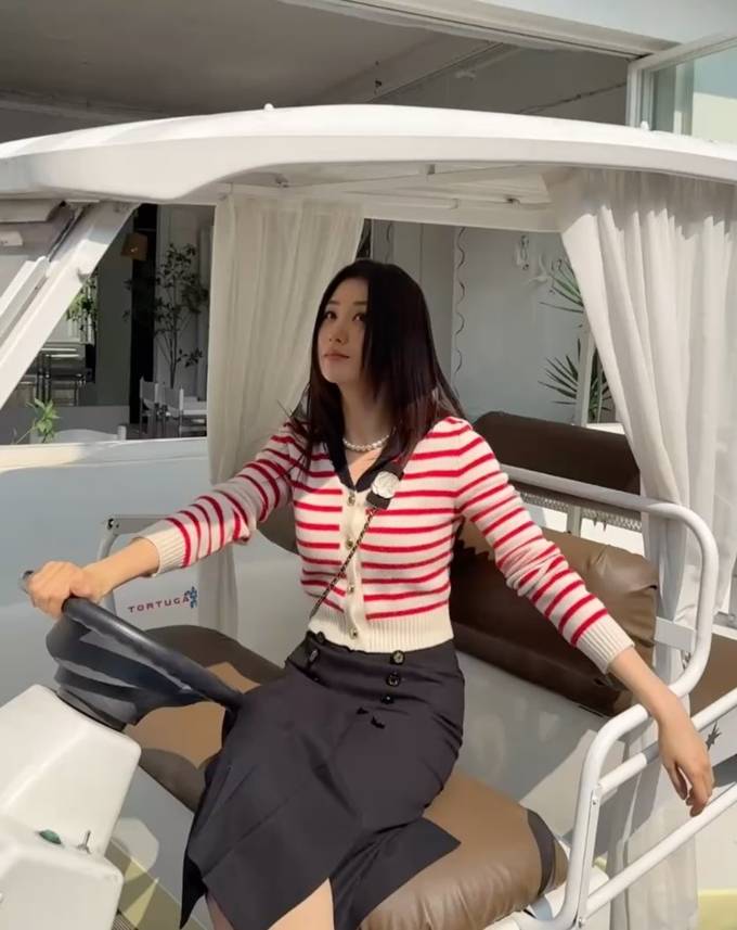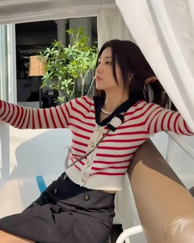 공개한 사진과 영상에서 박하선은 크림 컬러 바탕에 레드 스트라이프 라인이 더해진 카디건에 버튼 디테일에 슬림한 핏이 더해진 하이웨이스트 디자인의 다크한 스커트를 매치한 프레피룩으로 단정하면서도 생동감있는 분위기를 드러냈다.