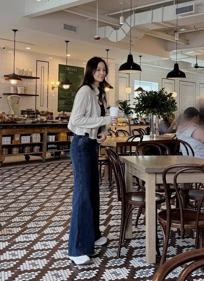 공개한 사진에서 손태영은 블랙 이너에 크롭 니트 카디건을 걸쳐 더 슬림해 보이는 스타일에 A자 핏의 데님 팬츠를 매치해 늘씬한 비주얼을 더욱 돋보이게 했다.