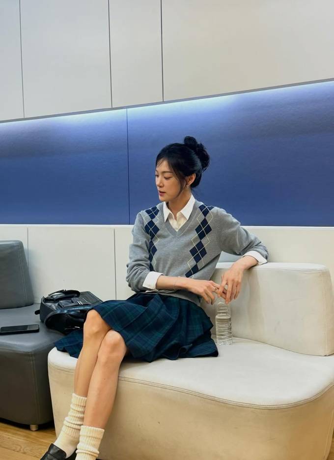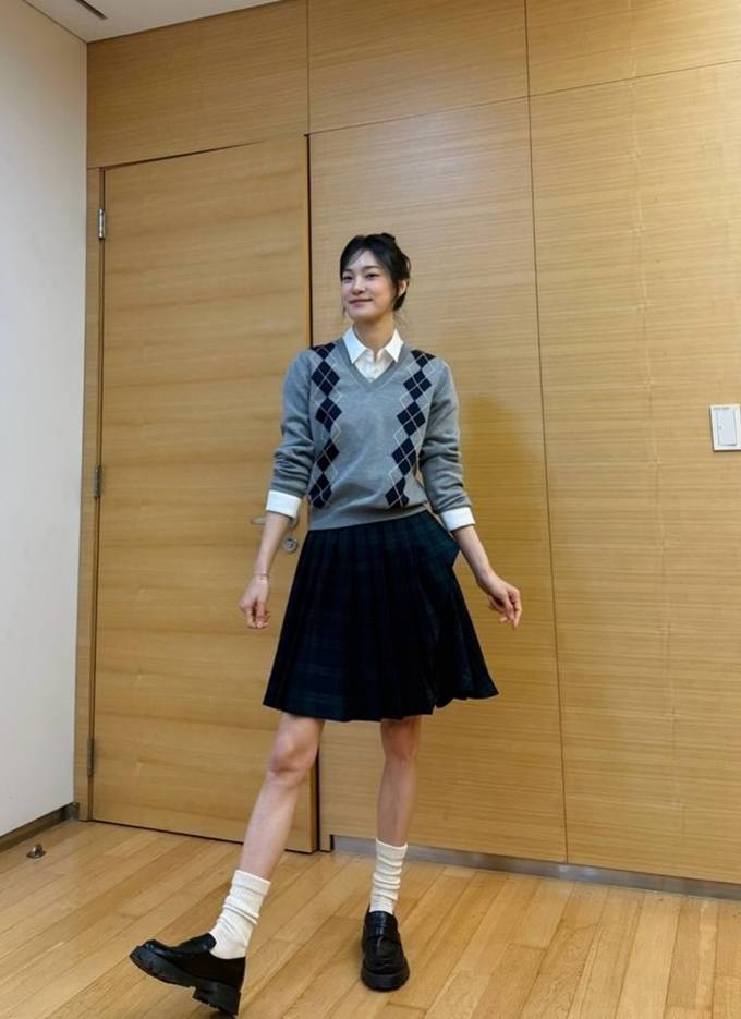 공개한 사진에서 옥자연은 올려 묶은 생기발랄 헤어 스타일에 화이트 셔츠와 아가일 패턴의 니트 스웨터를 레이어드하고 블랙 플리츠 스커트를 매치한 프레피룩으로 더 어려 보이는 하이틴 스타일을 완성했다.