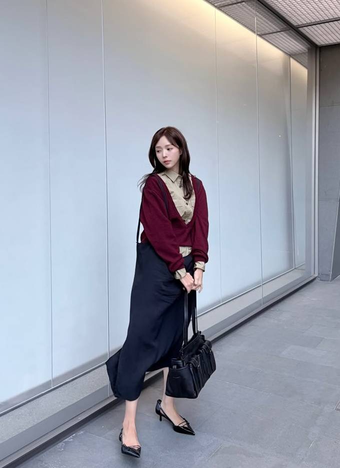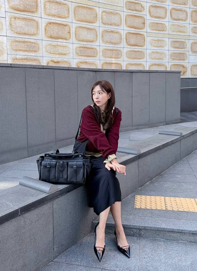 1. 1.채수빈, 봄 청순녀의 선택! 핫레드와 베이지 니트&셔츠 꿀조합 레이어드 외출룩