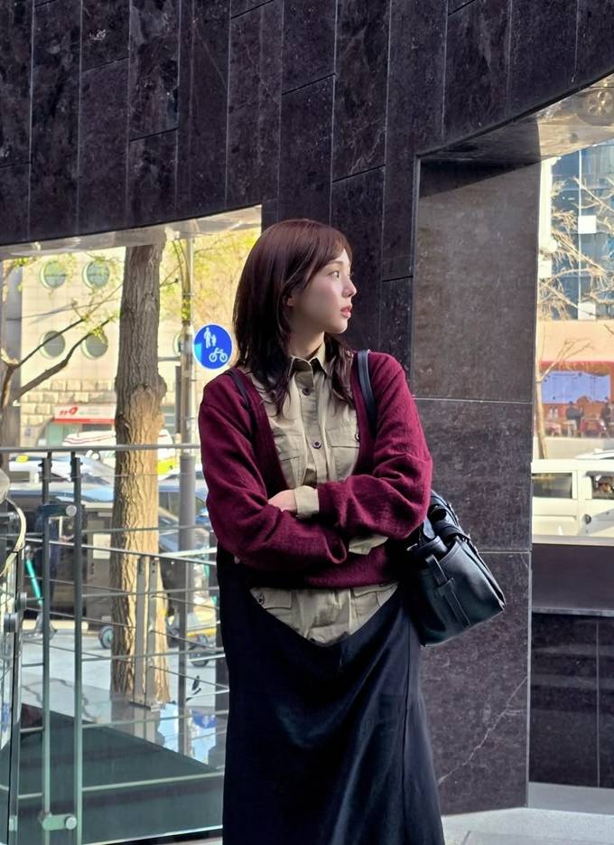 채수빈, 봄 청순녀의 선택! 핫레드와 베이지 니트&셔츠 꿀조합 레이어드 외출룩