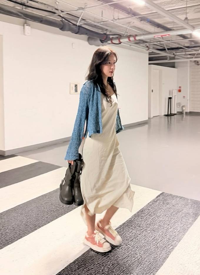 배우 임수향이 슬립 원피스에 블루 셔켓을 매치한 브런치룩으 성수동 스트릿을 장악했다.