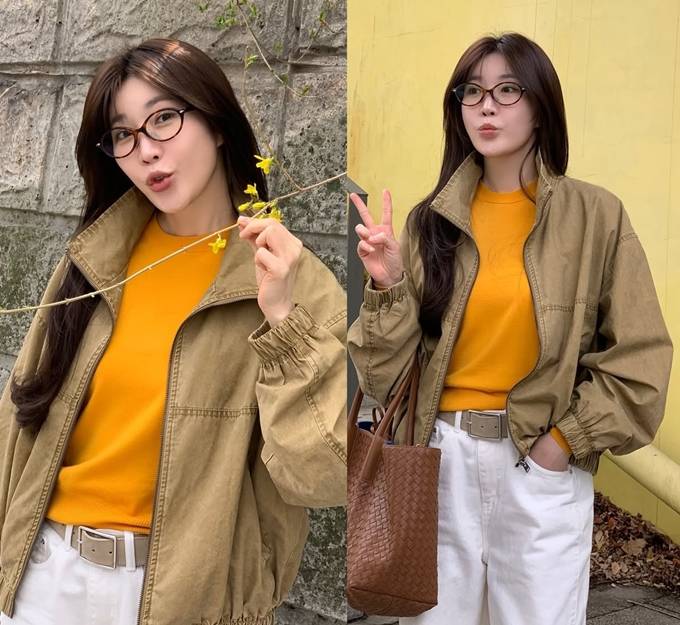 이해리, 봄 꽃놀이와 찰떡! 옐로&브라운 티셔츠와 봄버 재킷 톤온톤 나들이룩