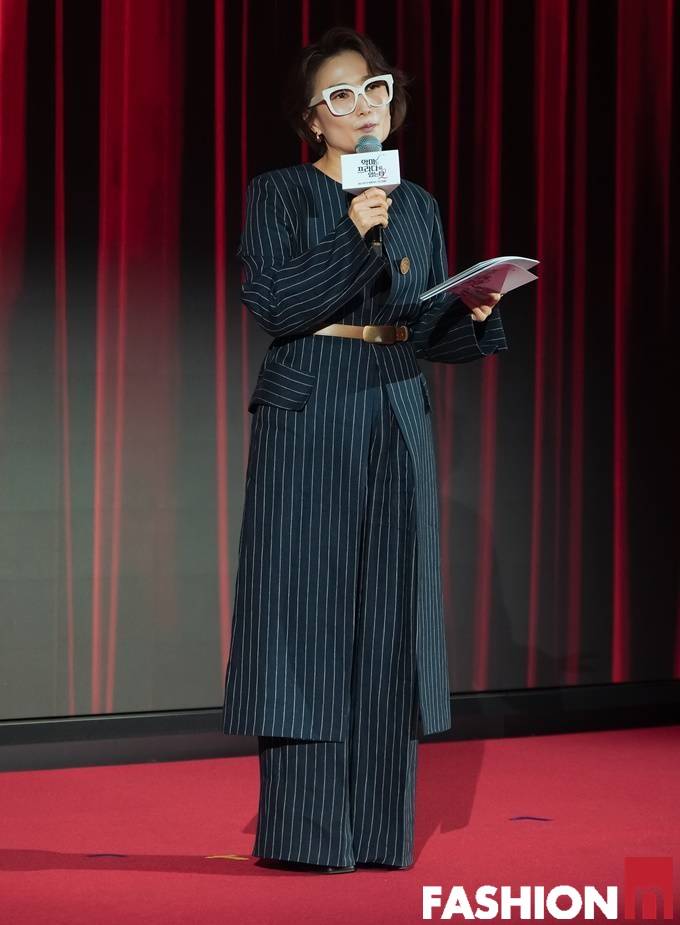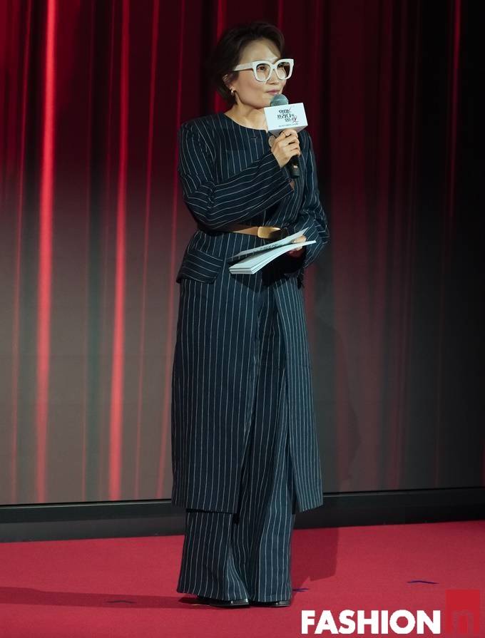 방송인 박경림이 벨티드 스트라이프 슈트룩으로 파워풀한 에디터룩을 연출했다.