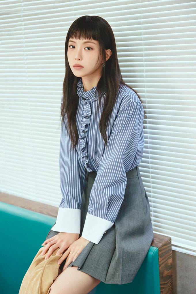 손나은처럼 프릴 디테일의 프릴넥 블라우스, 입체감있는 A라인 플리츠 미니 스커트와 함께 연출하면 발랄한 걸리시룩, 미니 드레스 위에 걸쳐주면 모던하고 클래식한 간절기룩 등