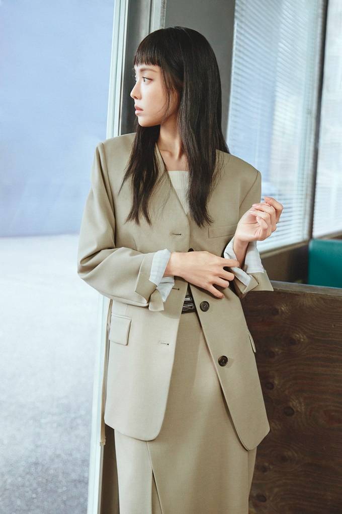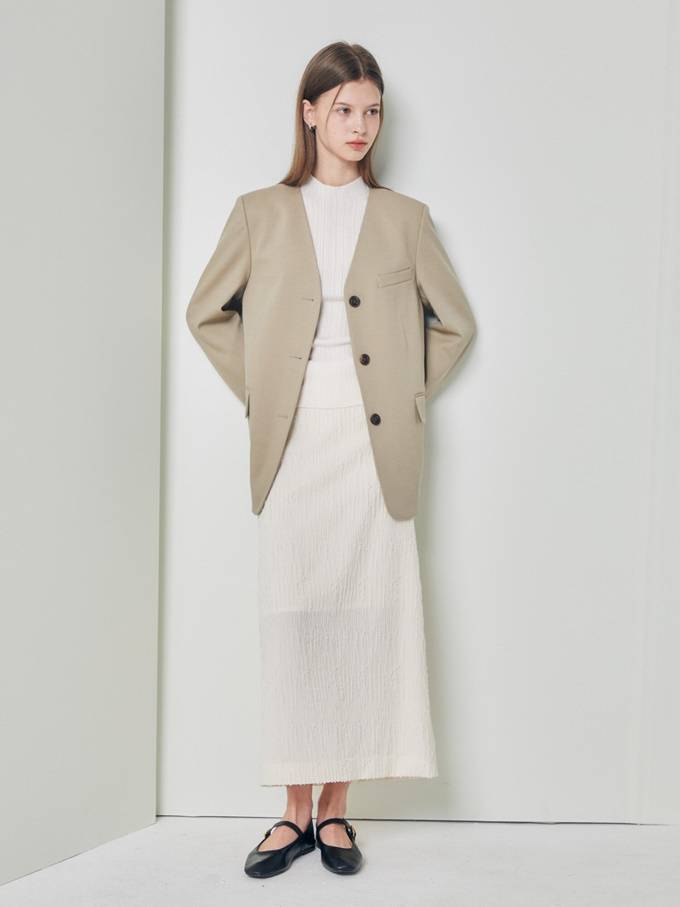 'JJ지고트'의 칼라리스(목깃 없는) 재킷은 미니멀한 디자인과 박시한 실루엣으로 여성스러우면서 도회적인 분위기를 연출한다.